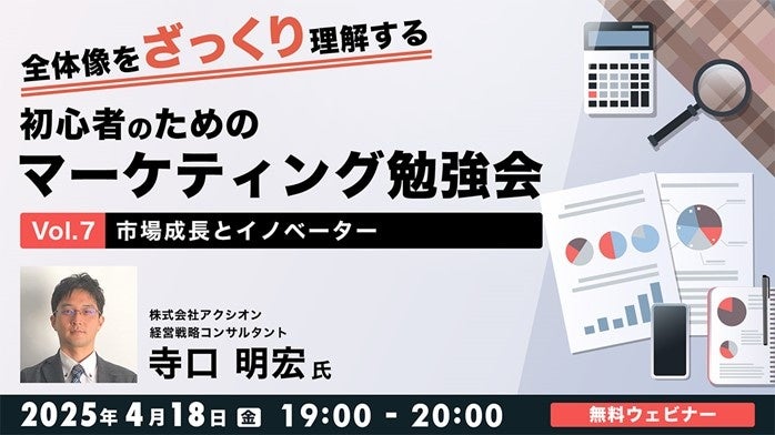 株式会社クリーク・アンド・リバー社(C&R社)は4月18日(金)、これからマーケティングを学ぶ方や未経験でマーケティングやメディア運用を担当されている方、マーケターをめざしている方などを対象に、無料のオンラインセミナー「全体像をざっくり理解する 初心者のためのマーケティング勉強会Vol.7 ~市場成長とイノベーター~」を開催します。