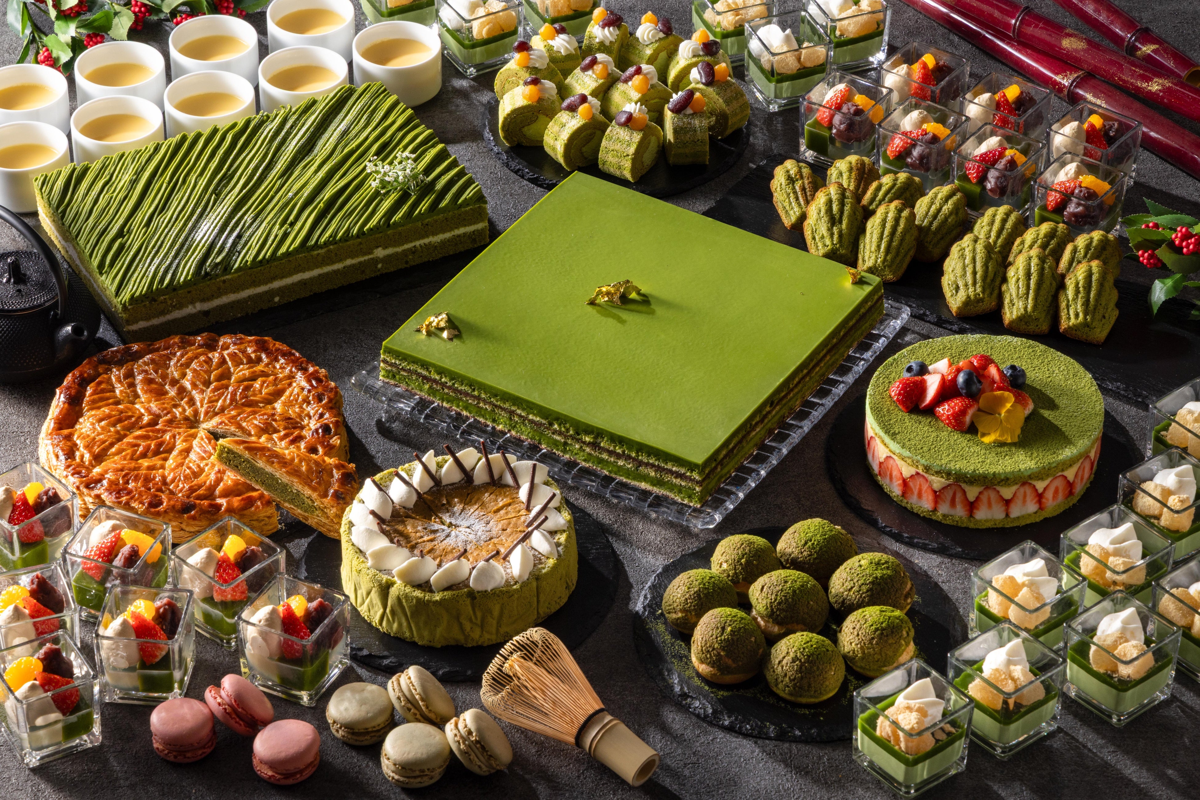 <スイーツ>抹茶オペラ、抹茶のモンブランショートケーキ、抹茶のフレジェ、抹茶のクッキーシュー、抹茶のフロマージュスフレ、抹茶のアーモンドパイ、抹茶のマドレーヌ、抹茶のパンナコッタ、あんみつ、抹茶のロールケーキ、プリン、割りチョコ、クッキー各種、