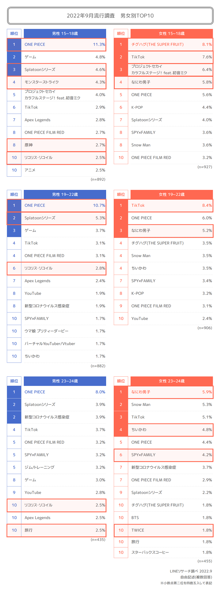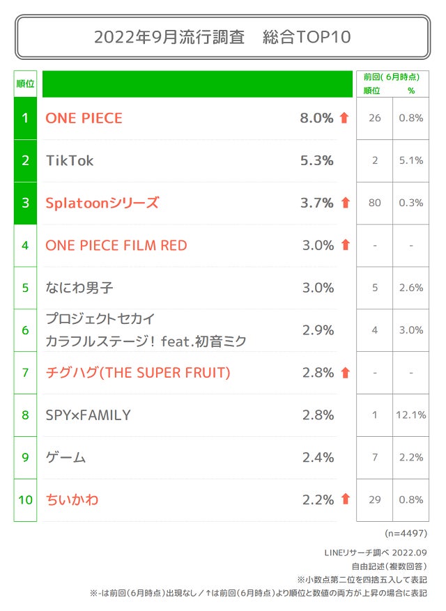 【LINEリサーチ】Z世代のトレンドランキングは「ONE PIECE」が総合1位 THE SUPER FRUITの「チグハグ」、「ちいかわ」、TVアニメ「リコリス・リコイル」が急浮上しランクイン
