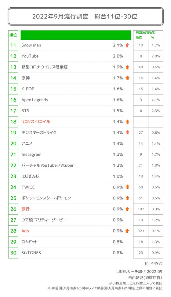 11位以降は歌手やアイドルが多数ランクインし、「Snow Man」「BTS」「TWICE」「Ado」「SixTONES」が並ぶ結果となりました。特に「Ado」は前回の323位から28位に急上昇しました。