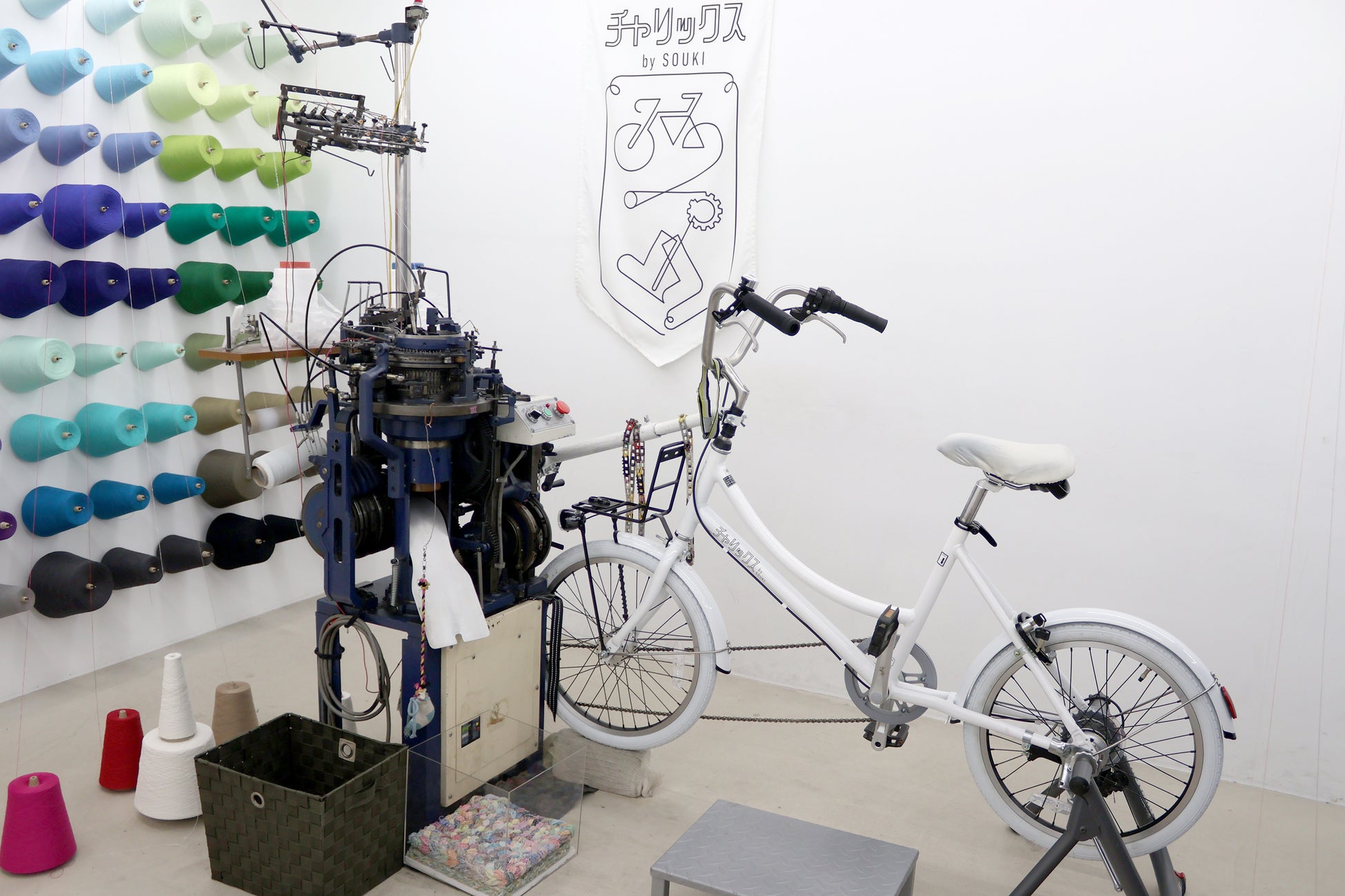 実際に工場で使用されていた靴下編み機と自転車を融合させた、株式会社創喜のオリジナルマシーン「チャリックス」。36色の中から3色の糸を自分で選び、ペダルを漕ぐことで靴下を編む製造工程が体験できます。