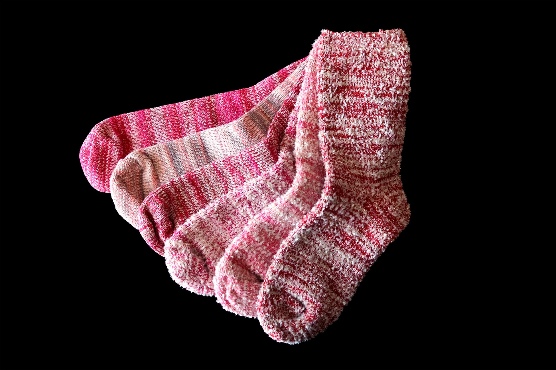 編み上がり後のつま先の縫製や仕上げはスタッフが担当し、自分だけのオリジナルカラーのローゲージ靴下が完成します。