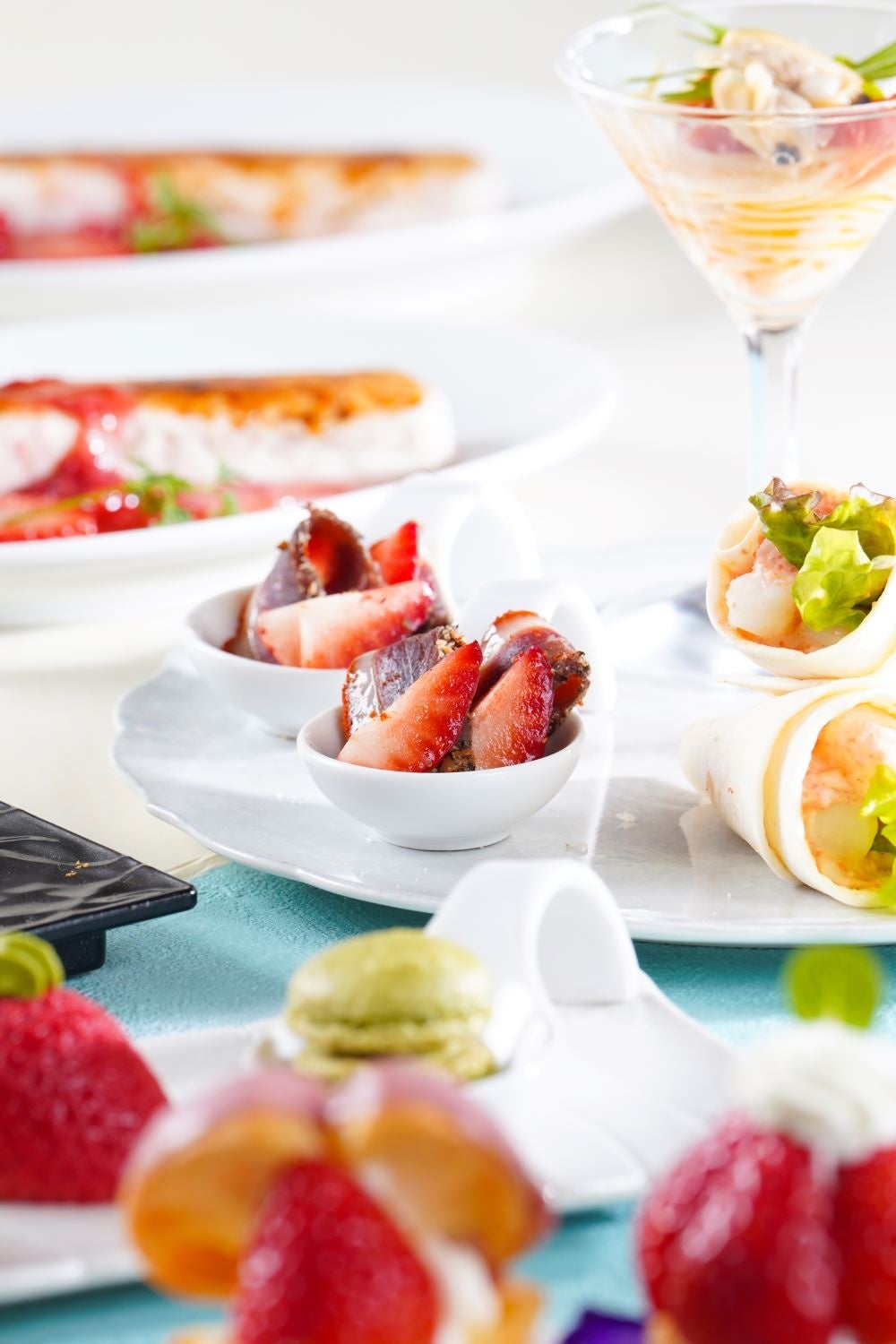 スイーツの目玉としてご用意するのは「いちごのカタラーナ」。お客様のお席でスタッフが表面をバーナーで炙り、香ばしくキャラメリゼして仕上げます。パリッとしたキャラメルの食感と、ひんやり濃厚なカタラーナ、甘酸っぱい苺の味わいが重なる、ライブ感も楽しめる主役スイーツです。