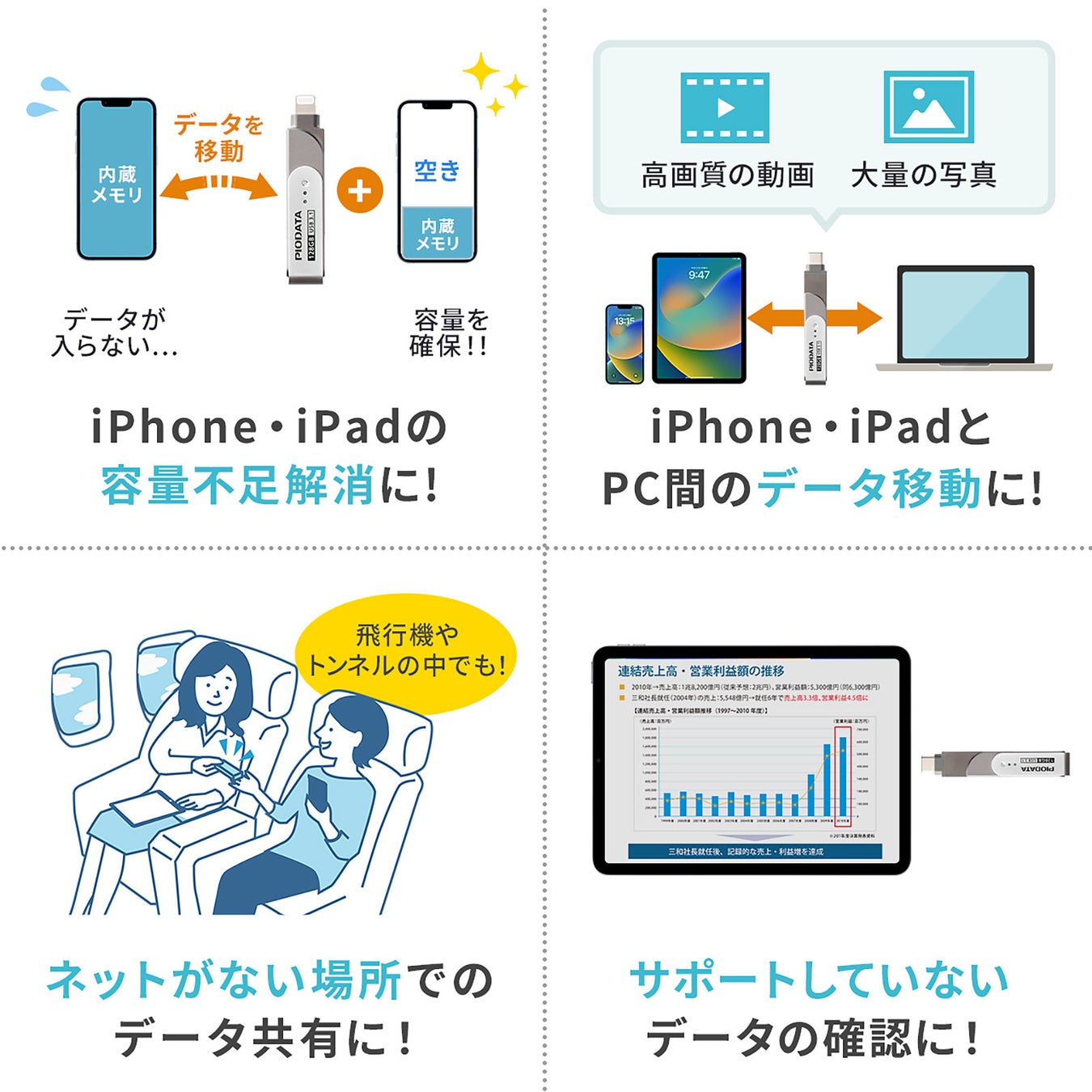 無料iOSアプリ「iXFlash」を使用してiPhone・iPad・iPod touchでのデータ共有、また、USB3.2 Gen1(USB3.1/3.0) Type-Cコネクタを使用して、パソコンとのデータ転送が可能です。
