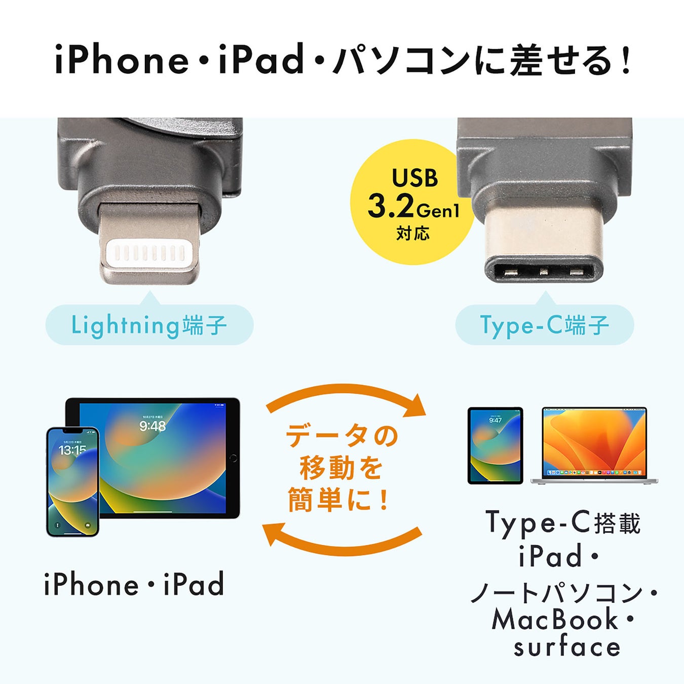 iPhone・iPad USBメモリ lightning-Type-Cメモリ Lightning対応 iPhone iPad MFi認証 スイング式