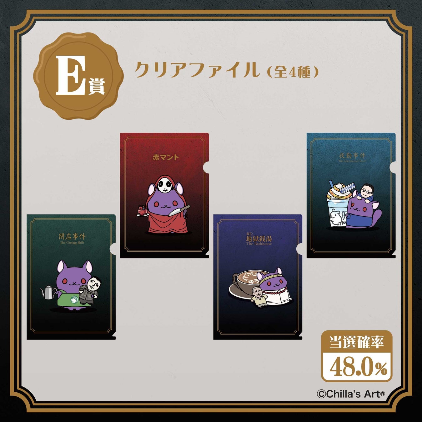本イベントではゲームクリエイター 「Chilla’s Art(チラズアート)」による人気ゲームタイトル『閉店事件』『夜勤事件』『地獄銭湯』『赤マント』をモチーフに、マスコットキャラクター「チラ丸」とゲームに登場する"クセ強"なキャラクターの、「ちょっとダークなカフェ」をイメージして描かれたイラストを使用した限定グッズが登場します。