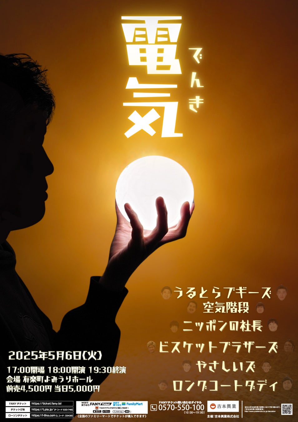 内容:3年ぶりの開催。ロングコートダティ、ビスケットブラザーズ、ニッポンの社長が上京後初の開催となります。『電気』の意味は公演を見ていただいたらわかります。一風変わったコンセプトのライブを、実力派大人気芸人たちと一緒にお楽しみください。