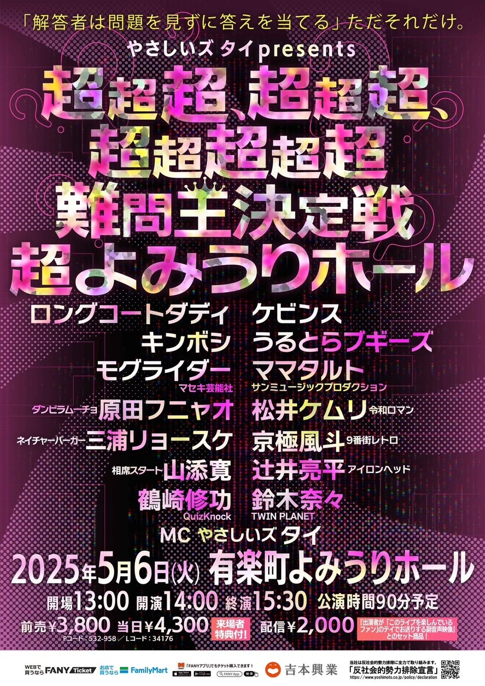内容:“超新感覚”クイズイベントとして絶大な人気を誇る本公演は、回を重ねるごとに開催規模を拡大。昨年12月には初めてルミネtheよしもとで開催され、会場チケットは即完売、配信チケットも1,200枚を突破。その後も3月にルミネtheよしもとにて第二回を開催。今回満を持して有楽町よみうりホールでの開催が決定。超キャパ1000人超!!豪華なゲストにもご期待ください。