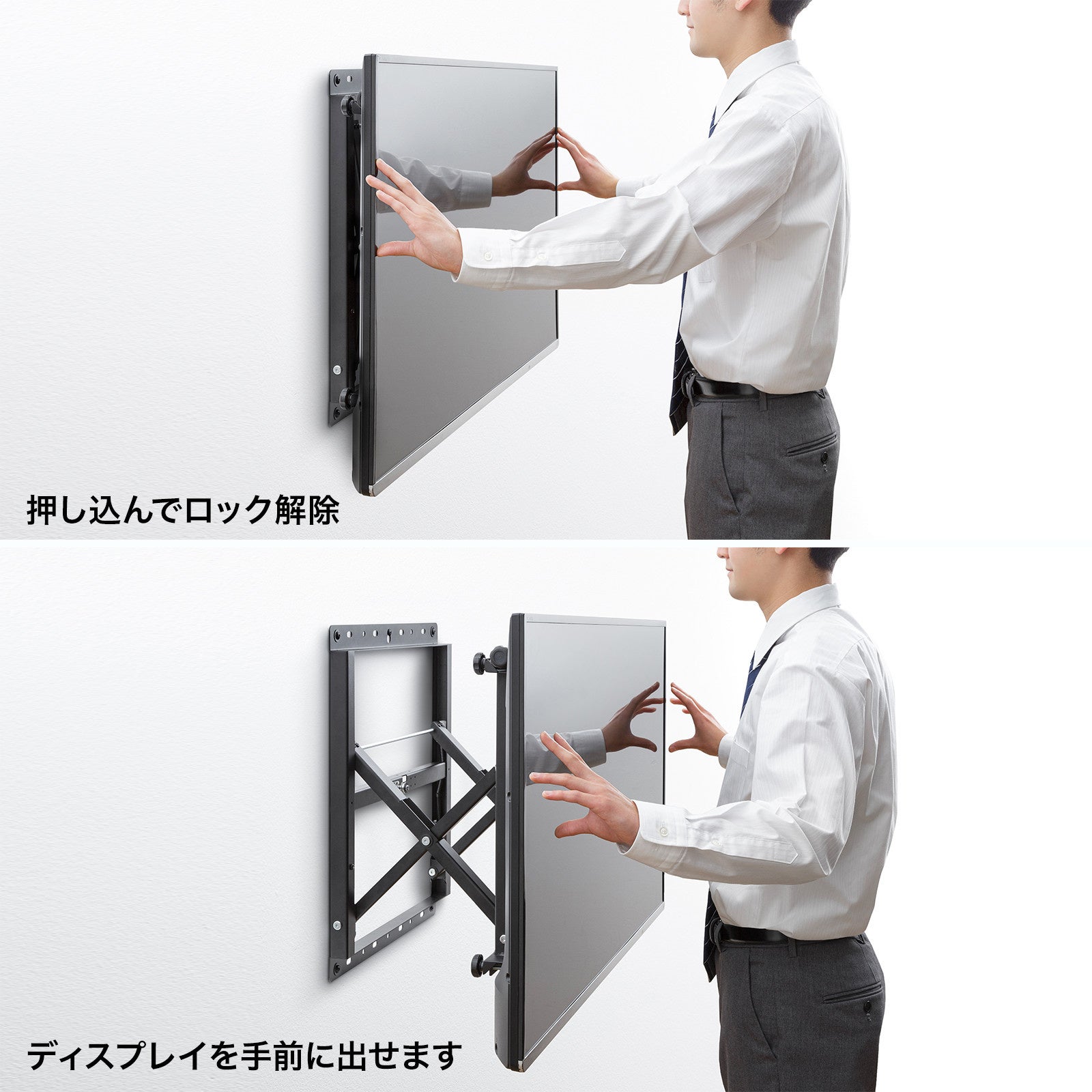 金具全体がプッシュ式になっており、ディスプレイを押し込むと金具のロックが解除され、手前に出てきます。壁面埋め込み時や設置後のディスプレイ背面のメンテナンスに非常に便利です。