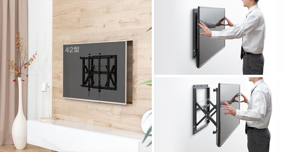 プッシュ式でテレビを手前に引き出せるのでメンテナンスがしやすいテレビ壁掛け金具を発売