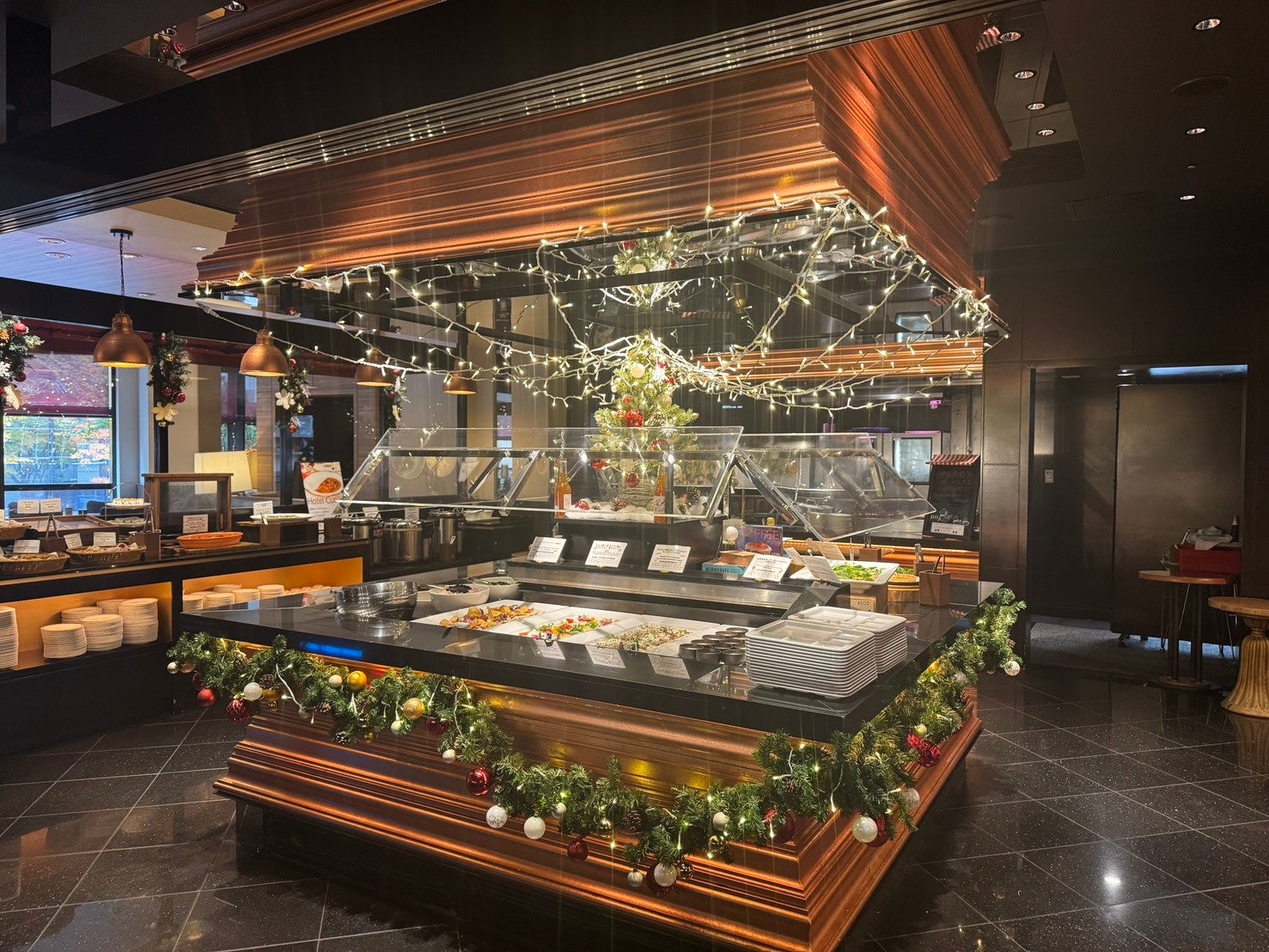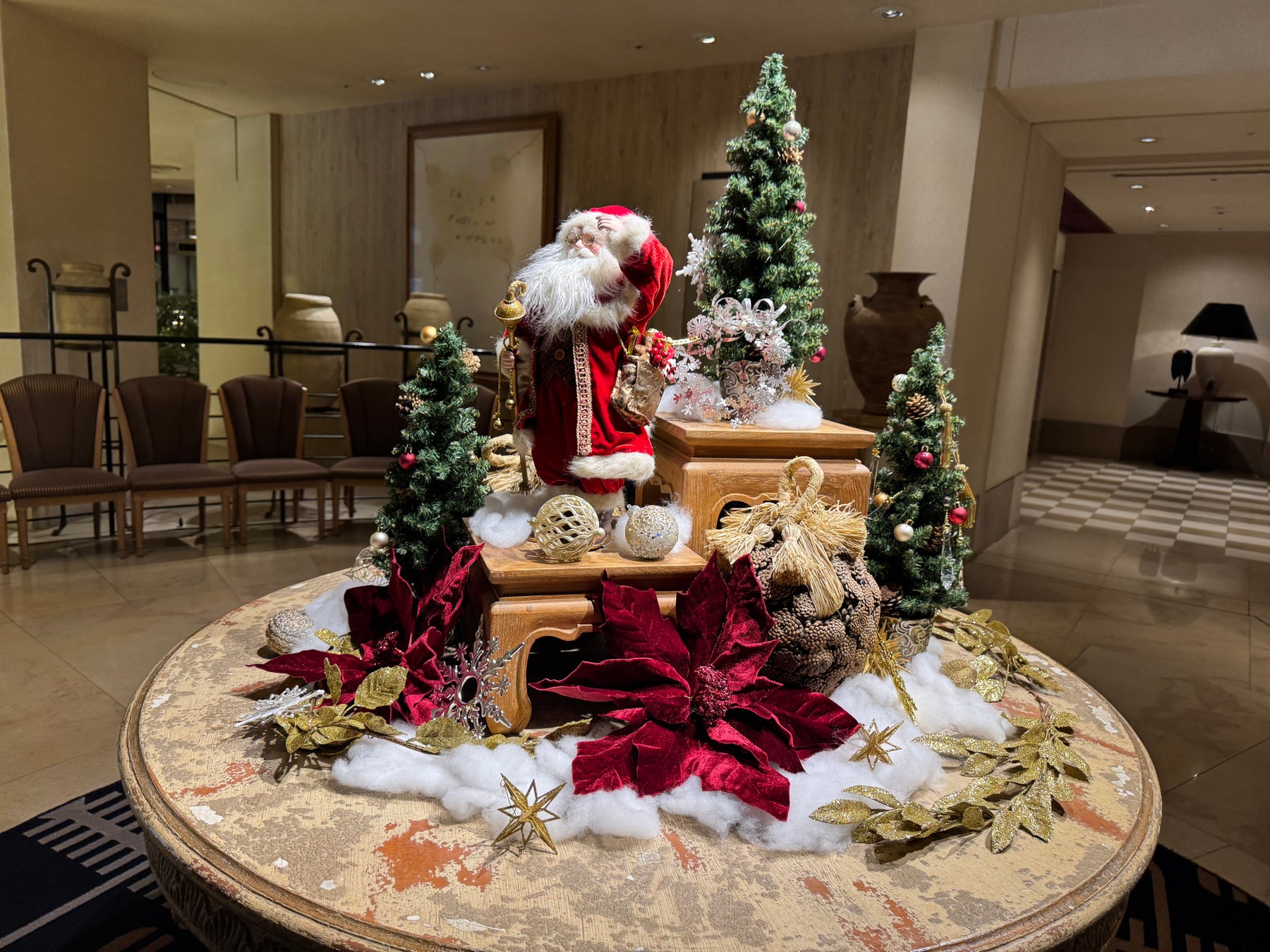 また、ロビーだけでなく、館内のレストランやエントランスにもクリスマスの装飾をご用意しております。サンタクロースや小さなツリーなど、写真に収めたくなるスポットも多く、ご来館の皆さまをやさしい光と温かな雰囲気でお迎えいたします。