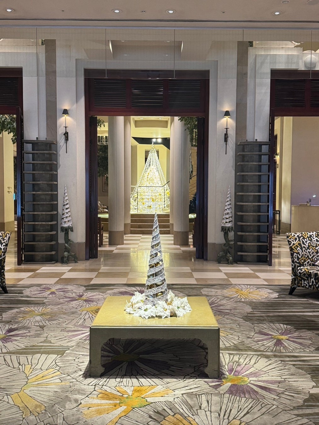 天井から降り注ぐ無数の光が反射し、水の揺らめきを思わせるような輝きを放つのが特徴です。昼間はクリアなきらめきがロビー全体に広がり、夜には温かみのある落ち着いた光が空間を包み込み、時間帯によって異なる表情をお楽しみいただけます。