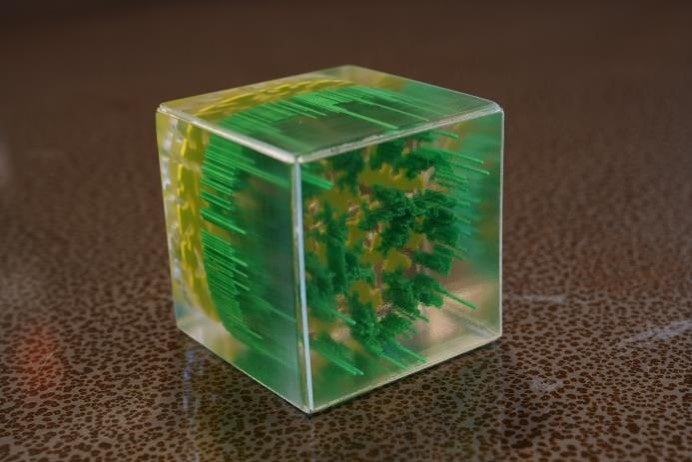 ・作品の特長と受賞のポイント:イスラム建築をモチーフとしたセルオートマトン(数学的な生物のシミュレーション手法)の造形作品。二次元のコンピュータシミュレーションに時間軸を与えて、x軸、y軸、t軸の三次元プリントされたものを表現している。