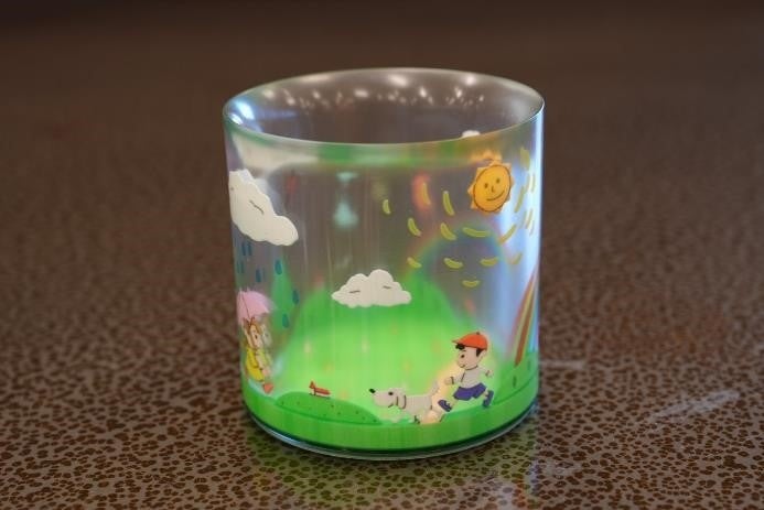 ・作品の特長と受賞のポイント:グラスの厚み部分にフルカラーでさまざまな景色が造形されたグラスで、温かさやほのぼの感を感じさせる作品。上や横など角度を変えて鑑賞でき、手前と奥のイラストが重なり合って背景が表現されている。