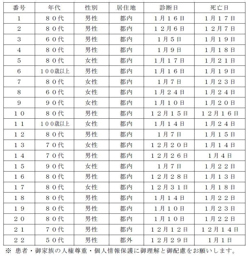 都内で新型コロナウイルスに感染した方が死亡されましたのでお知らせします。