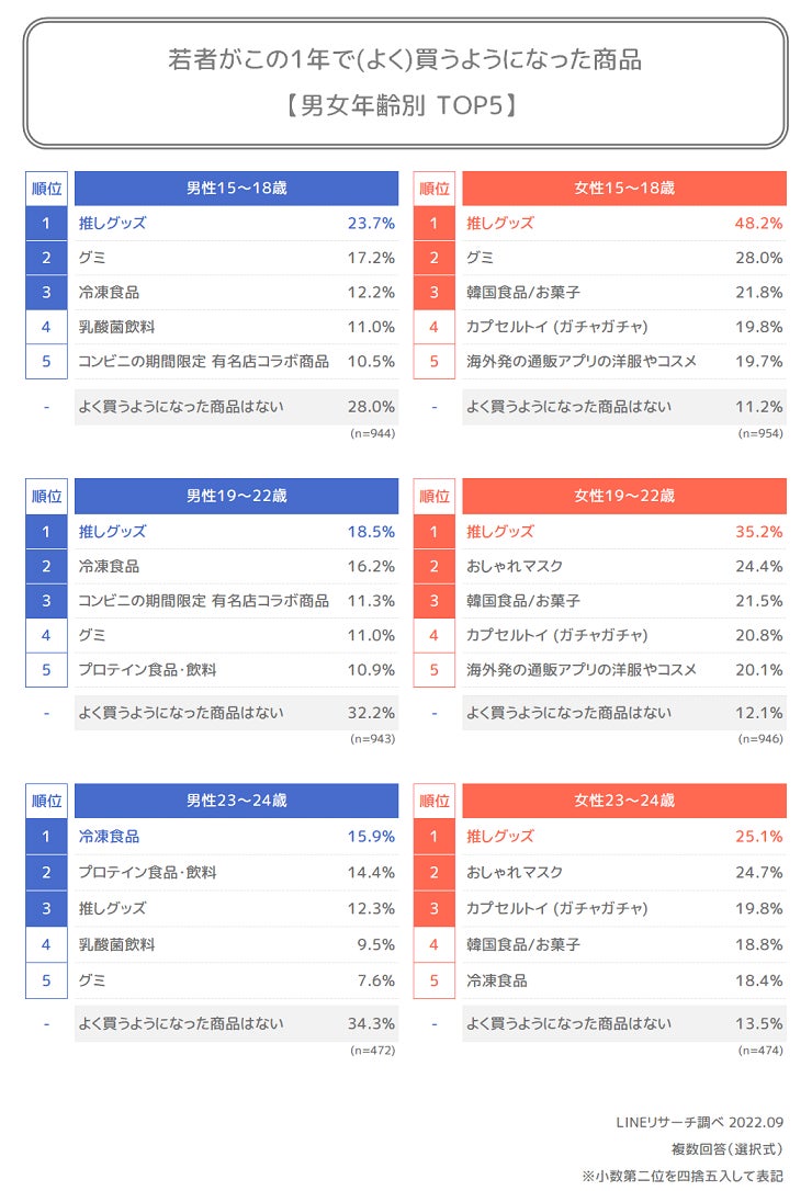 【LINEリサーチ】Z世代がこの1年でよく買うようになったものは「推しグッズ」が総合1位 女性は「韓国食品/お菓子」「おしゃれマスク」、男性は「プロテイン食品・飲料」も上位にランクイン