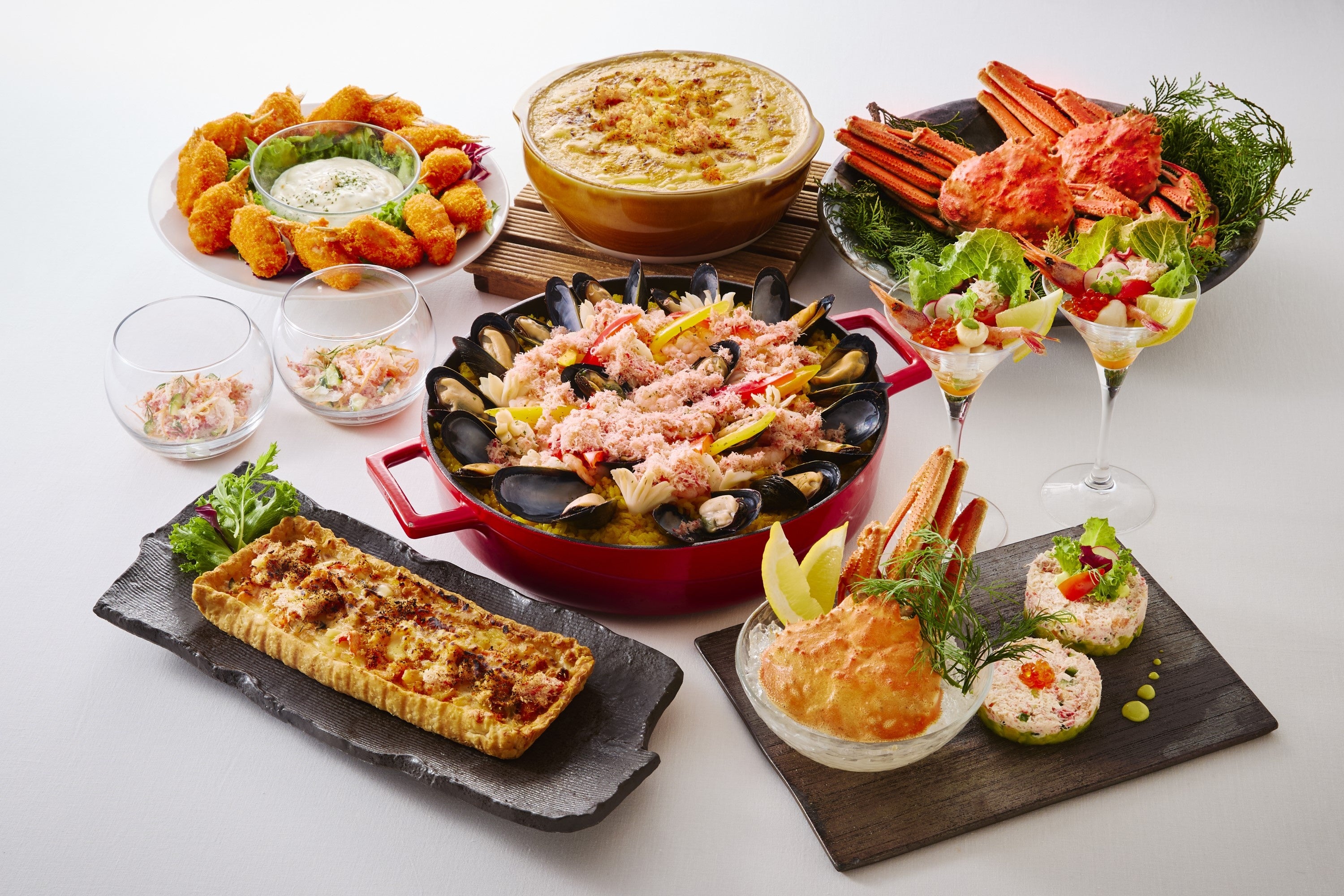 冷製ボイルベニズワイガニ(カクテルソース・土佐酢・スイートチリソース/ディナー限定)、カニ入りオマール海老の冷製フラン、サーモンテリーヌ カニとキャビア添え、タイ風ココナツ風味のカニカクテル(ディナー限定)、スパイシートマトソースパスタ(ランチ限定)、北海道産水タコのグリルサラダ、ローストビーフのサラダ レフォールソース、オレンジとクランベリー風味のチキンサラダ など