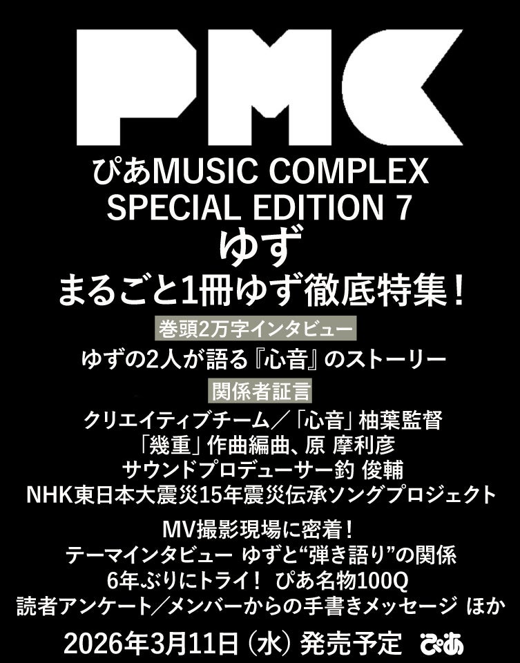 本書は、2020年2月発売の『ぴあMUSIC COMPLEX (PMC) SPECIAL EDITION2 ゆず』“まるごと1冊ゆず”から6年を経て刊行する第2弾。同日発売のゆずのニューアルバム『心音(しんおん)』と連動し、ゆずの現在地を徹底特集します。