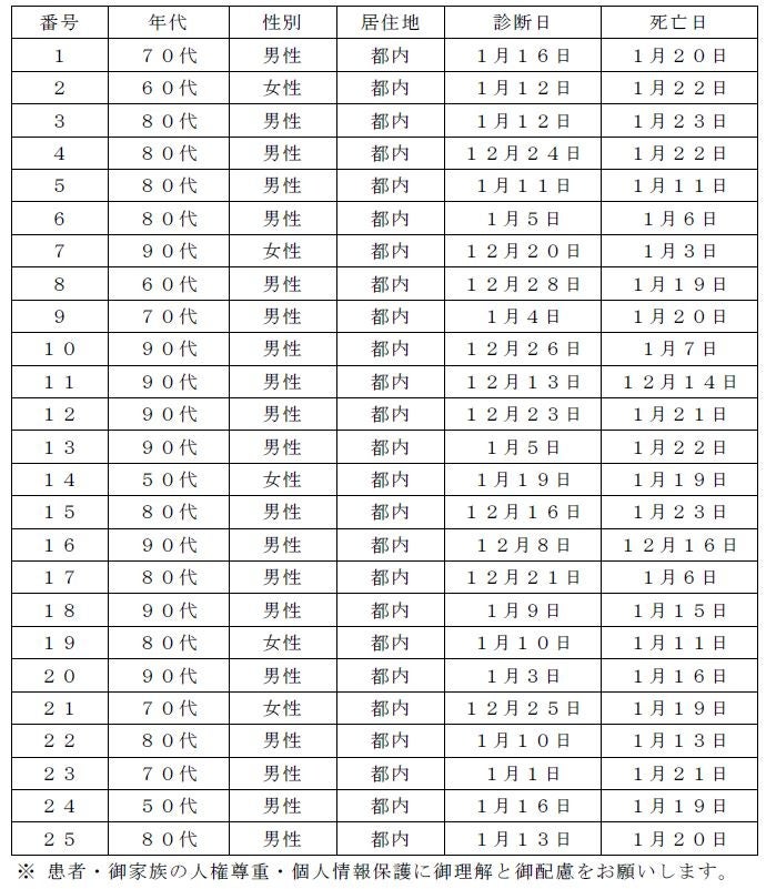 都内で新型コロナウイルスに感染した方が死亡されましたのでお知らせします。