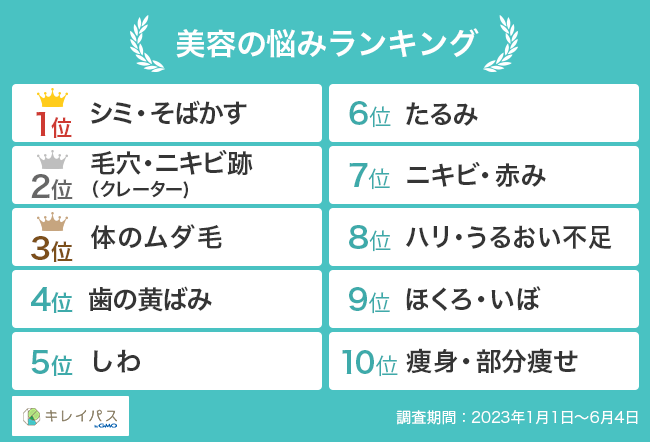 昨年の「美容医療年間人気ランキング」(https://www.gmo.jp/news/article/8145/)に引き続き、2023年上半期も「キレイパス byGMO」ユーザーの美容医療に対する意識がうかがえる「美容の悩み」「気になる部位」「人気の施術」「世代別人気の施術」「男性に人気の施術」の5つの分野でのランキングを集計しました。
