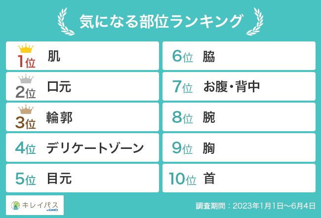 気になる部位ランキング1位は【肌】で、光治療(フォトフェイシャルなど)やダーマペンなどの人気施術が含まれていることから、昨年同様1位を独占する結果に。