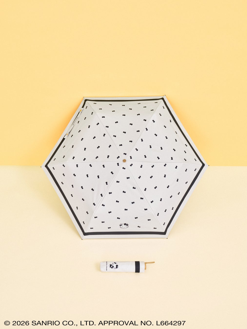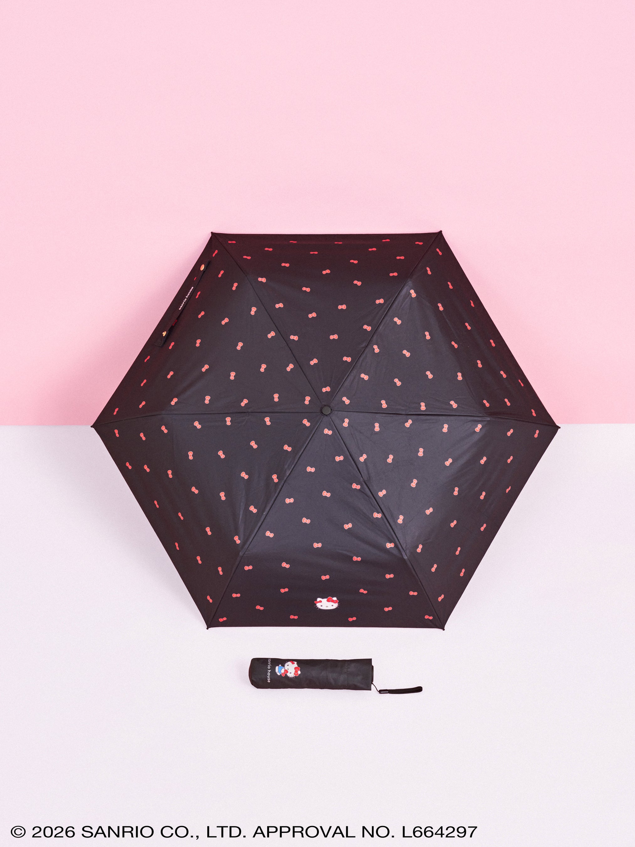 株式会社サンリオのハローキティのリボンが散りばめられた総柄デザインでブラックとオフホワイトの使いやすいカラー展開です。sanrio house オリジナルの、リボンを2つ付けたデザインのハローキティがワンポイントとなり、アクセントになっています。