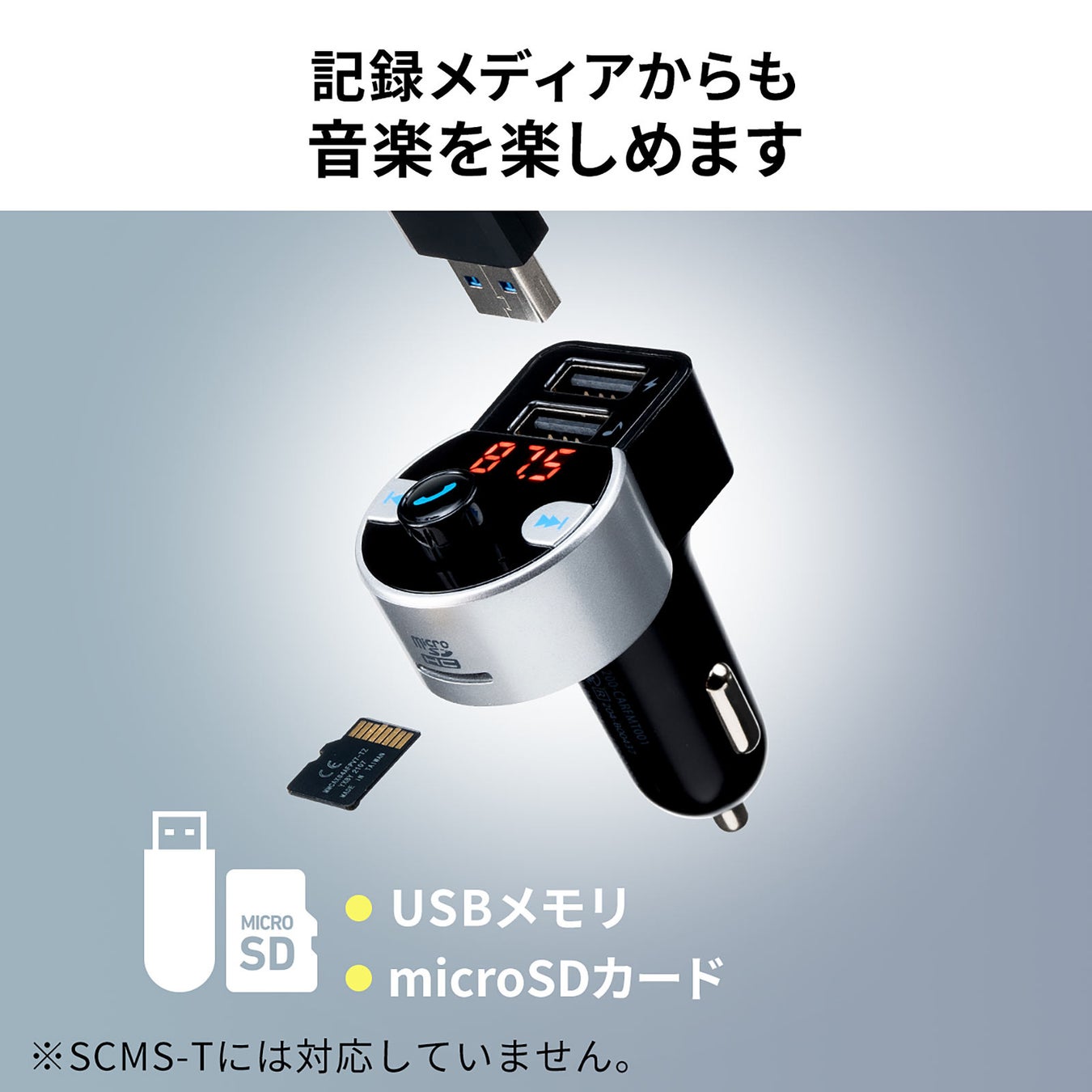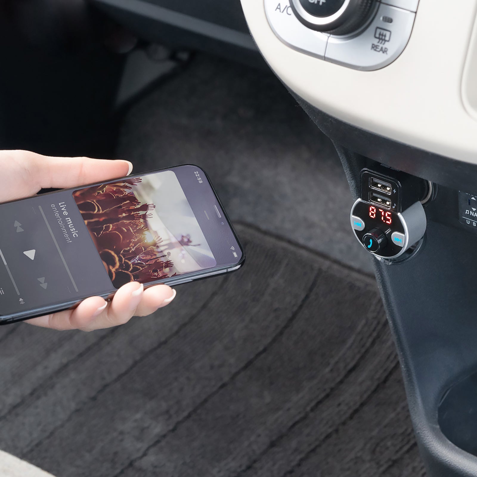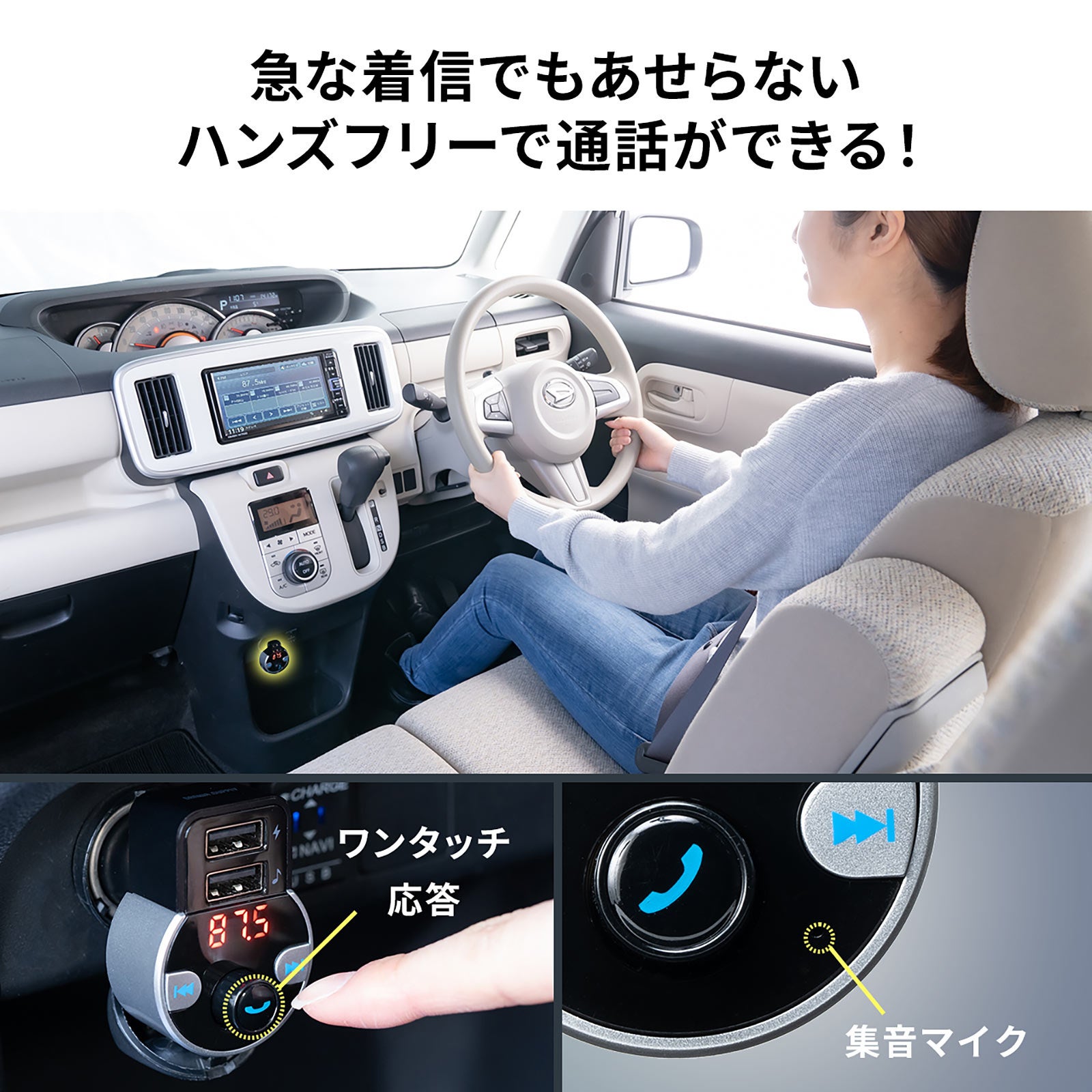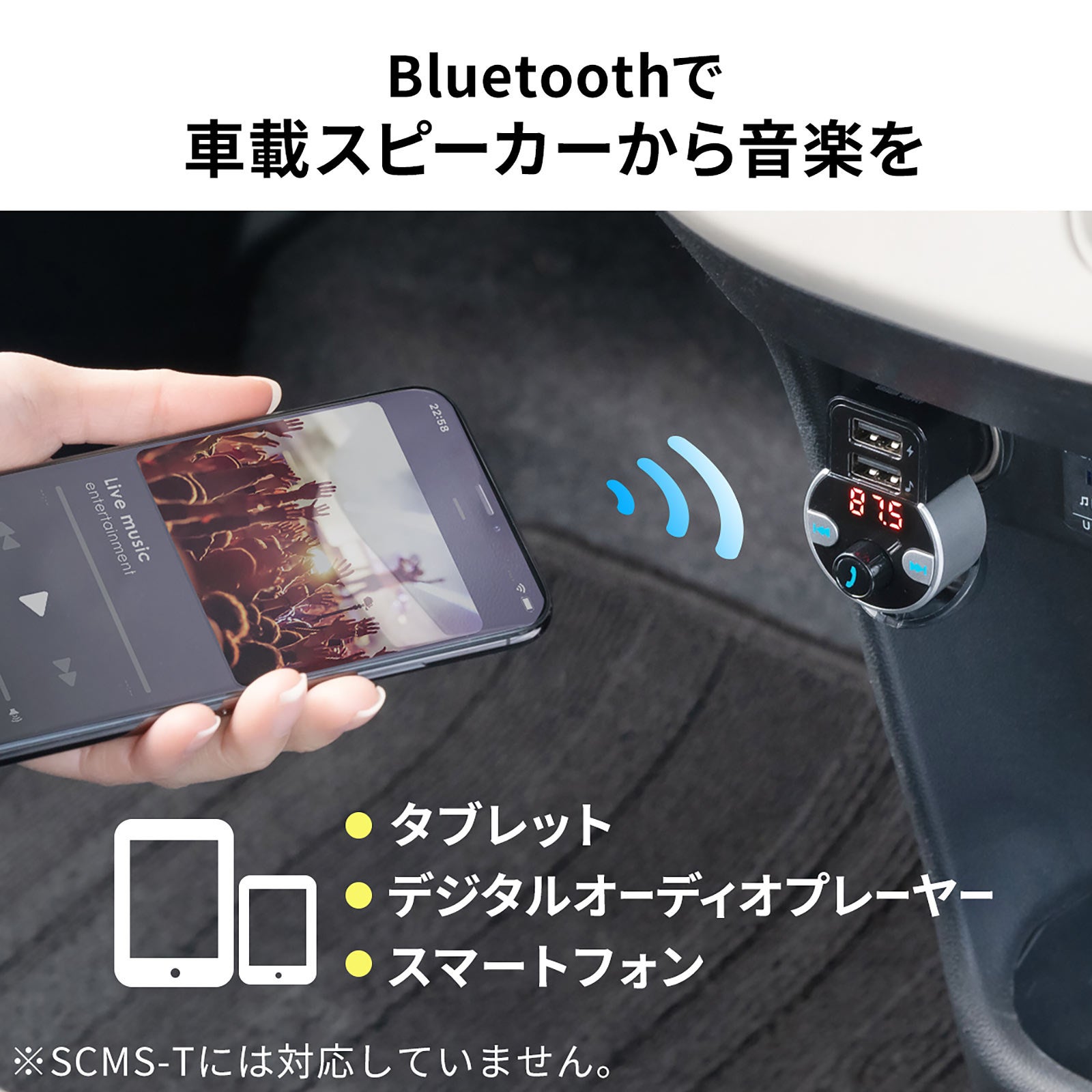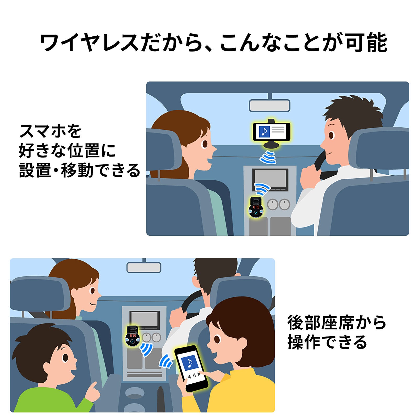 本製品は、スマートフォンやデジタルオーディオプレーヤーの音楽をカーステレオで楽しめるFMトランスミッターです。カーオーディオに外部入力端子やBluetooth接続機能が無い場合でも、スマホの音楽をFMラジオ経由で車内のスピーカーから再生できます。Bluetoothによるワイヤレス接続のため、ケーブルが絡まったり邪魔になったりしません。