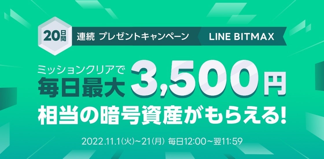 LINEの暗号資産事業およびブロックチェーン関連事業を展開するLINE Xenesis株式会社(所在地:東京都品川区、代表取締役社長CEO:林 仁奎、以下「LINE Xenesis」)は、暗号資産取引サービス「LINE BITMAX」において、キャンペーン期間中ミッションを達成したユーザーに、LINEの独自暗号資産「LINK」を毎日最大3,500円相当プレゼントする「20日間連続プレゼントキャンペーン」を11月1日(火)より開催することをお知らせいたします。