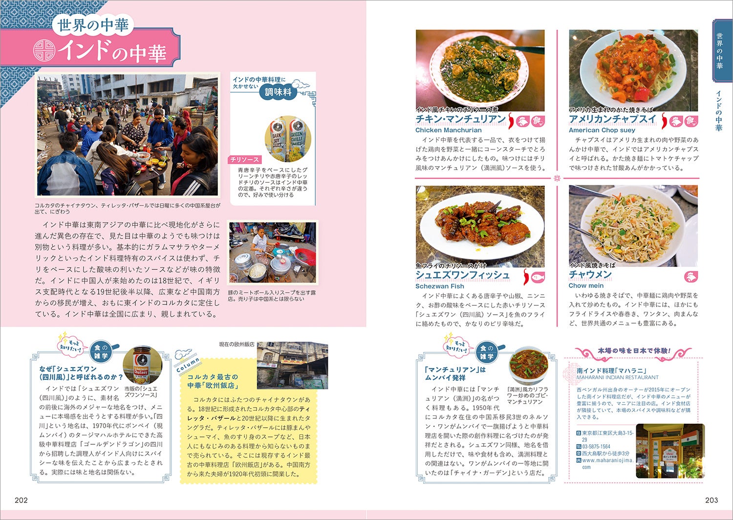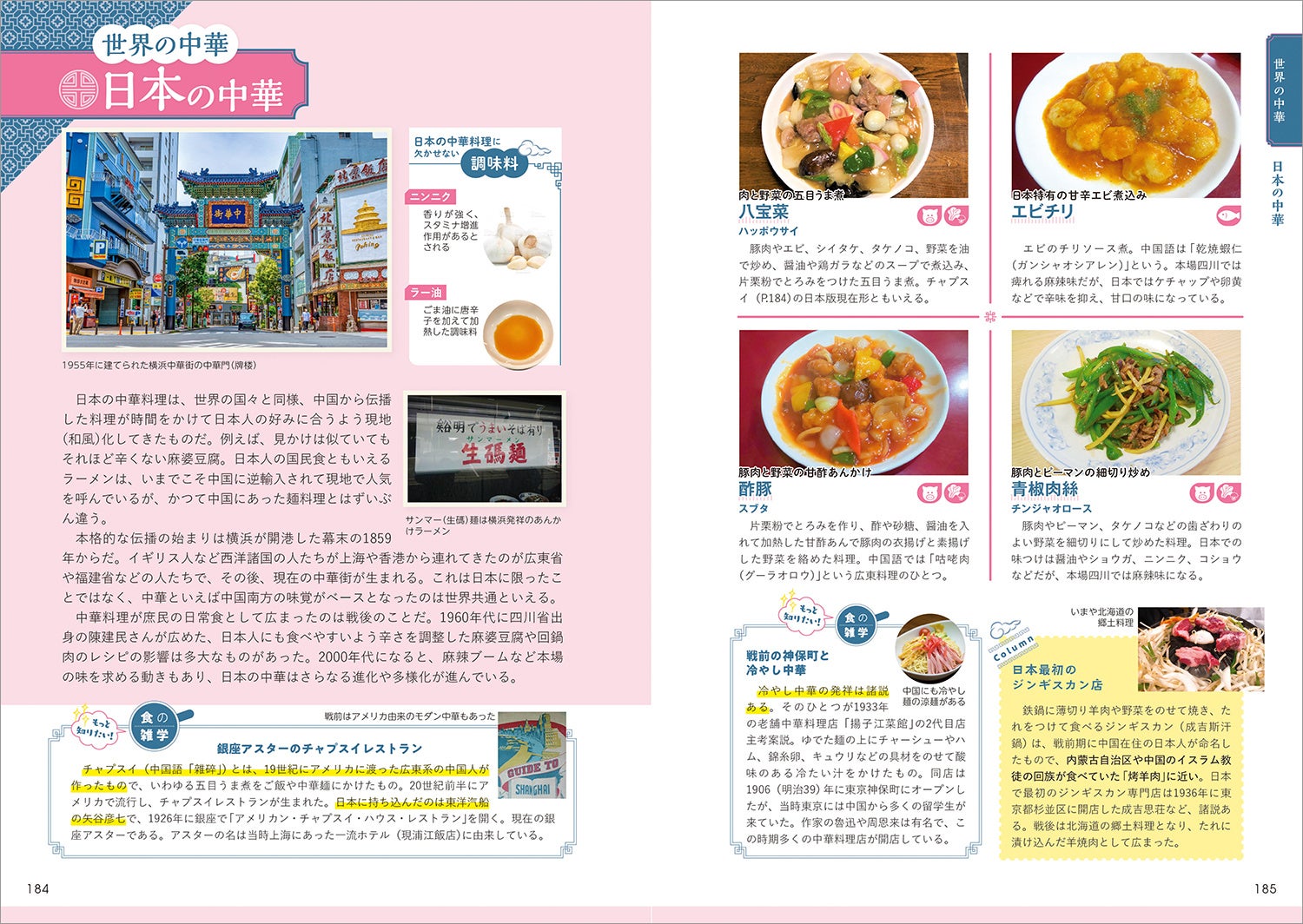 そして、中国から世界に伝わったアレンジ中華や、現地で生まれた各国オリジナル中華もご紹介。「中華丼や天津飯は日本で生まれた!?」「インドでおなじみのアメリカンチャプスイ」「韓国のジャージャー麺(チャジャンミョン)はカラメルが隠し味」など、個性豊かな中華が目白押し。日本で本場の味が楽しめるレストラン情報付きです。