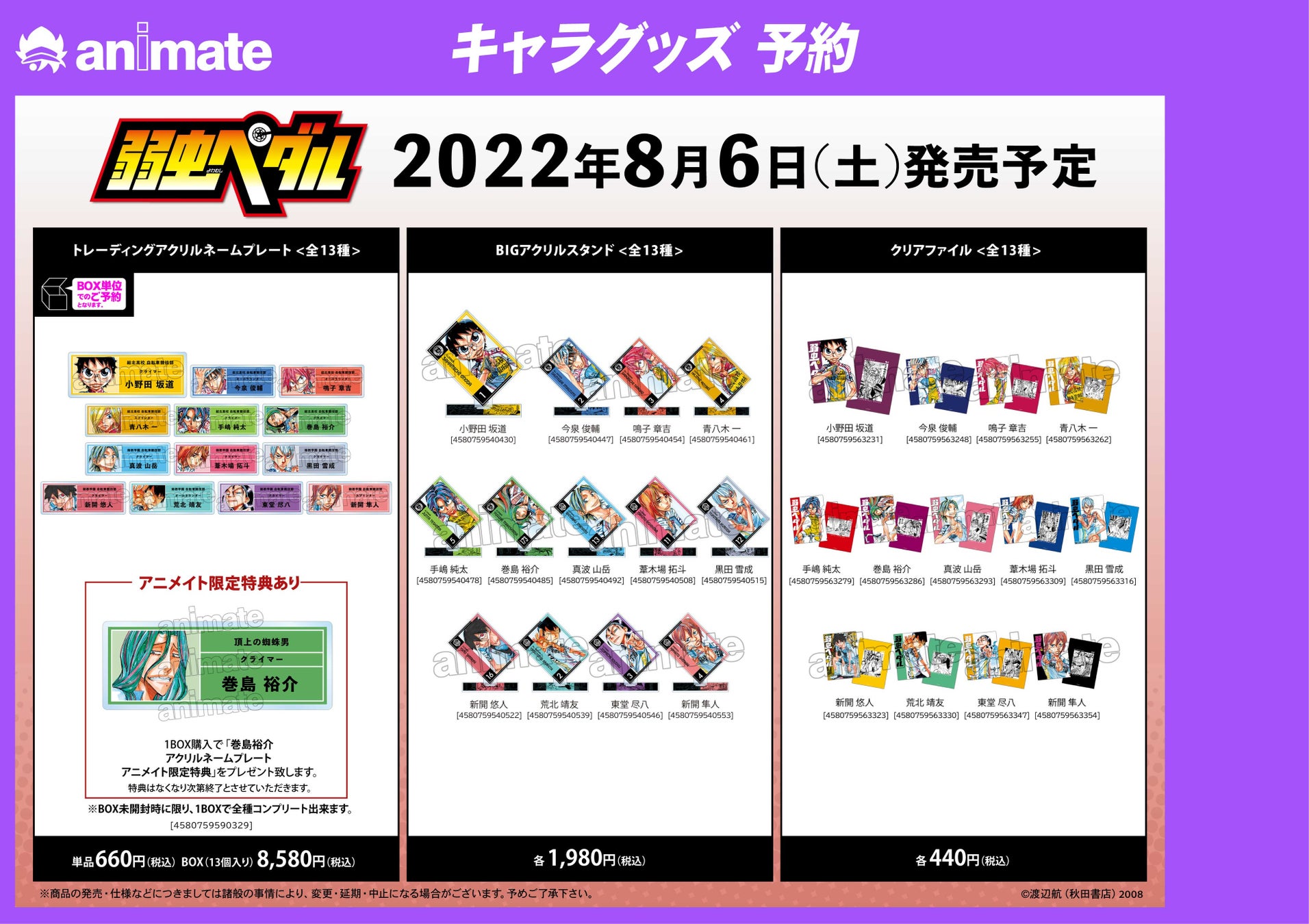 ※8月22日(月)より開始予定のECサイト「AMNIBUS」の事後通販では、BOX購入特典として「小野田坂道 アクリルネームプレート AMNIBUS限定特典」を予定しております。