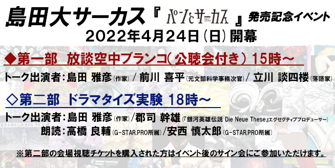 トークショーは二部制となっており、第一部は島田雅彦氏、前川喜平氏、立川談四楼氏の3名をお招きし、作品について現在の情勢を踏まえてディープに語る「放談空中ブランコ(公聴会付き)」、第二部は「ドラマタイズ実験」としてアニメーション『銀河英雄伝説 Die Neue These』 エグゼクティブプロデューサーである郡司幹雄氏をゲストに島田雅彦氏とトークを展開しつつ、俳優の高橋良輔氏(G-STAR.PRO所属)、安西慎太郎氏(G-STAR.PRO所属)両名により『作者セレクションの名シーン』の朗読を予定しております。