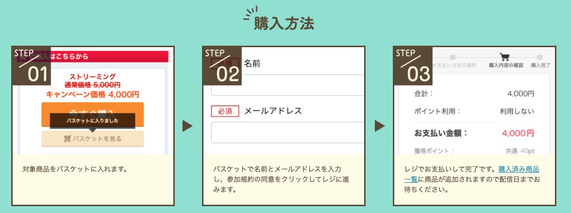 ②バスケットで名前とメールアドレスを入力し、参加規約の同意をクリックしてレジに進みます。