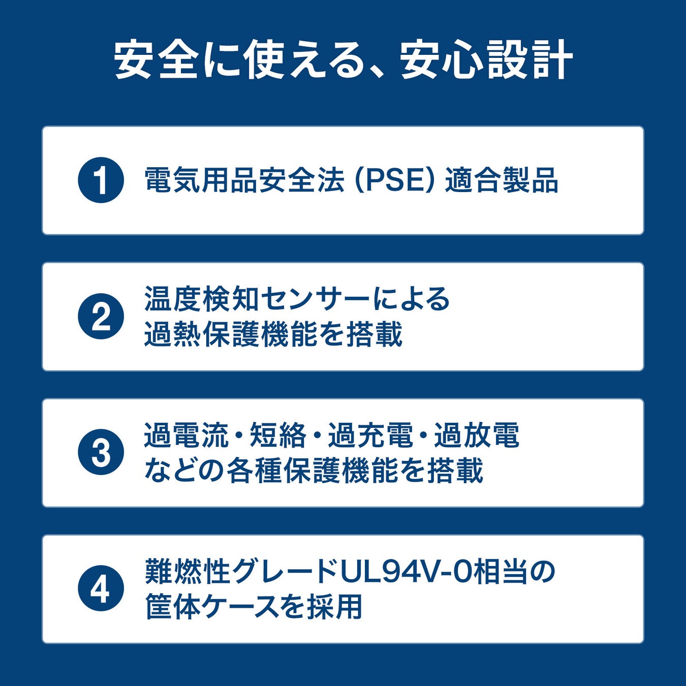 過充電、過放電、過電圧、過電流、短絡保護機能に加え、本体及び内蔵電池を異常発熱から保護する過熱保護機能を搭載しています。筐体はUL94V-O相当の難燃性ケースを使用しています。