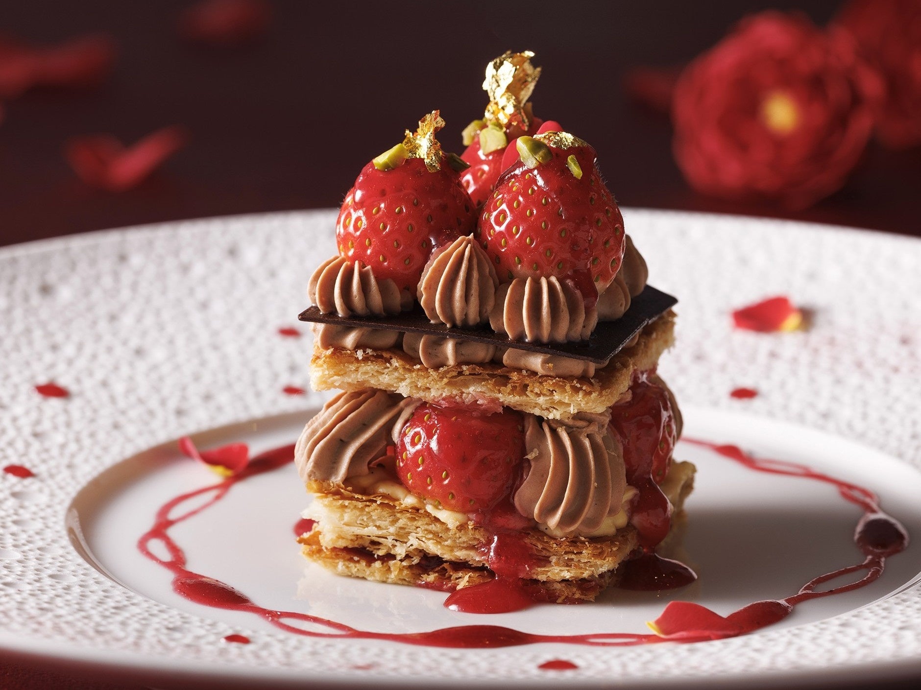 芳醇なバターの香りが広がるパイに苺の果実、チョコレートクリーム、カスタードを重ねたミルフィーユ。バレンタインシーズンにおすすめのデザートプレートです。
