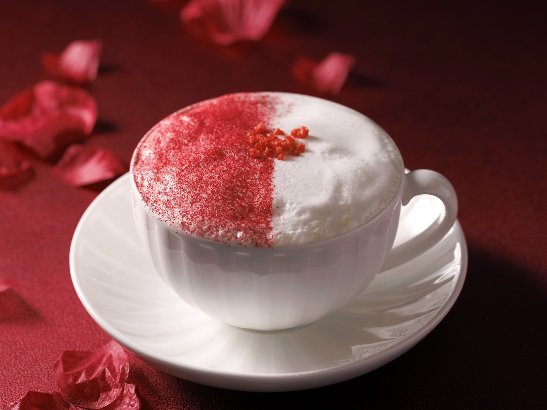 鮮やかな赤と、スチームミルクの柔らかな色合いが映えるホットラテ。ストロベリーソースの甘酸っぱさとミルクのまろやかさが調和する一杯です。