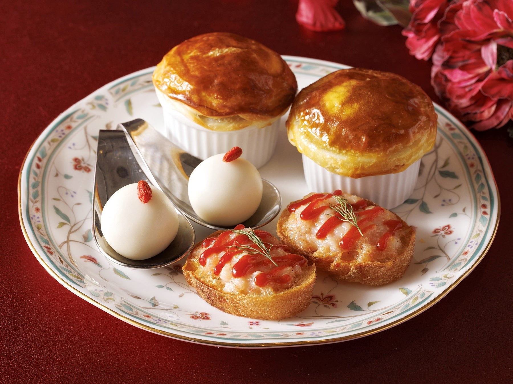 ポークブラウンシチューのココットパイ/海老のバゲット揚げ パプリカチリソース/帆立小柱の蒸し団子