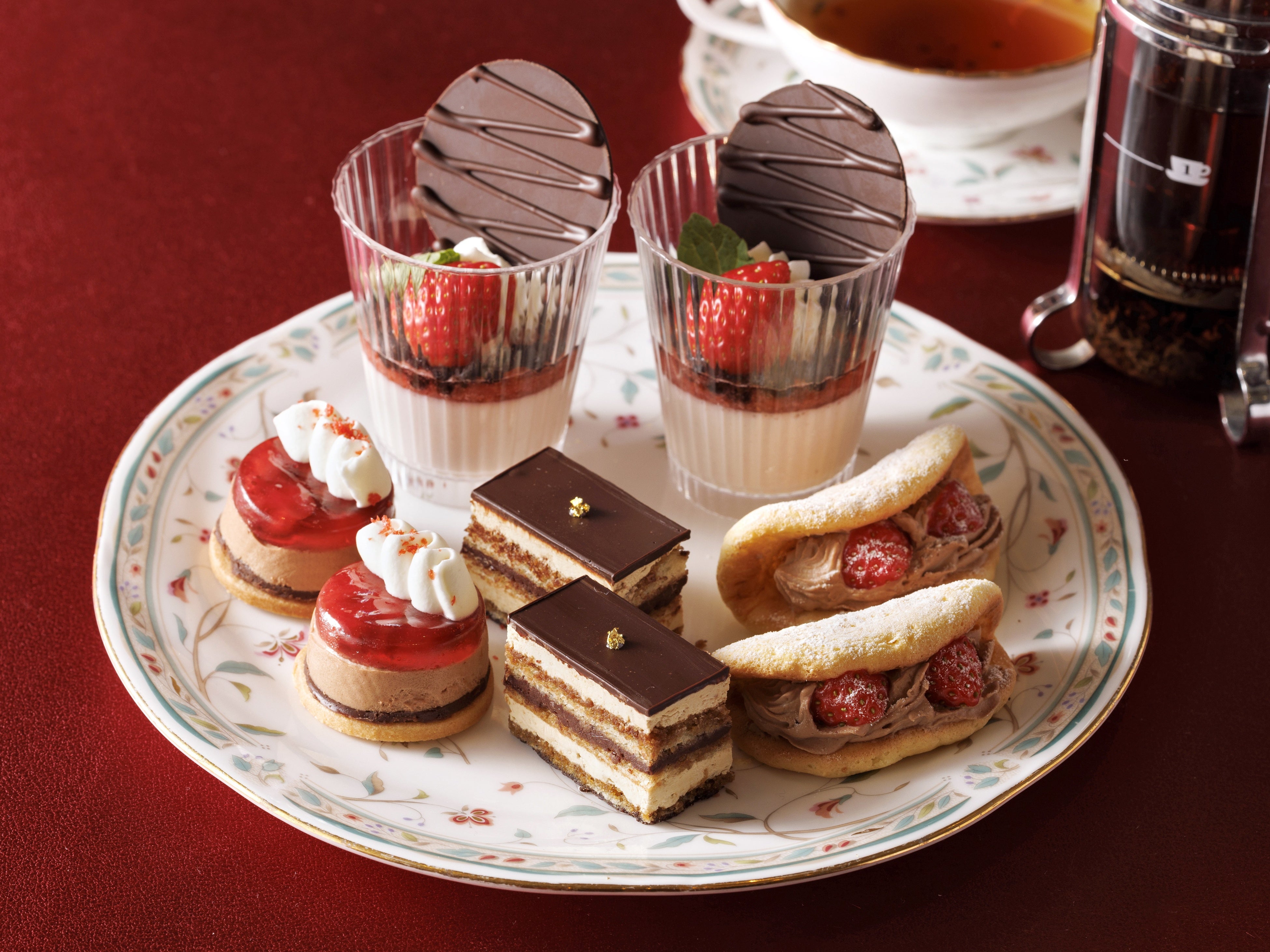 艶やかな苺とチョコレートを用いたスイーツと、冬らしいメニューを織り交ぜたセイボリーを味わうアフタヌーンティーセットです。