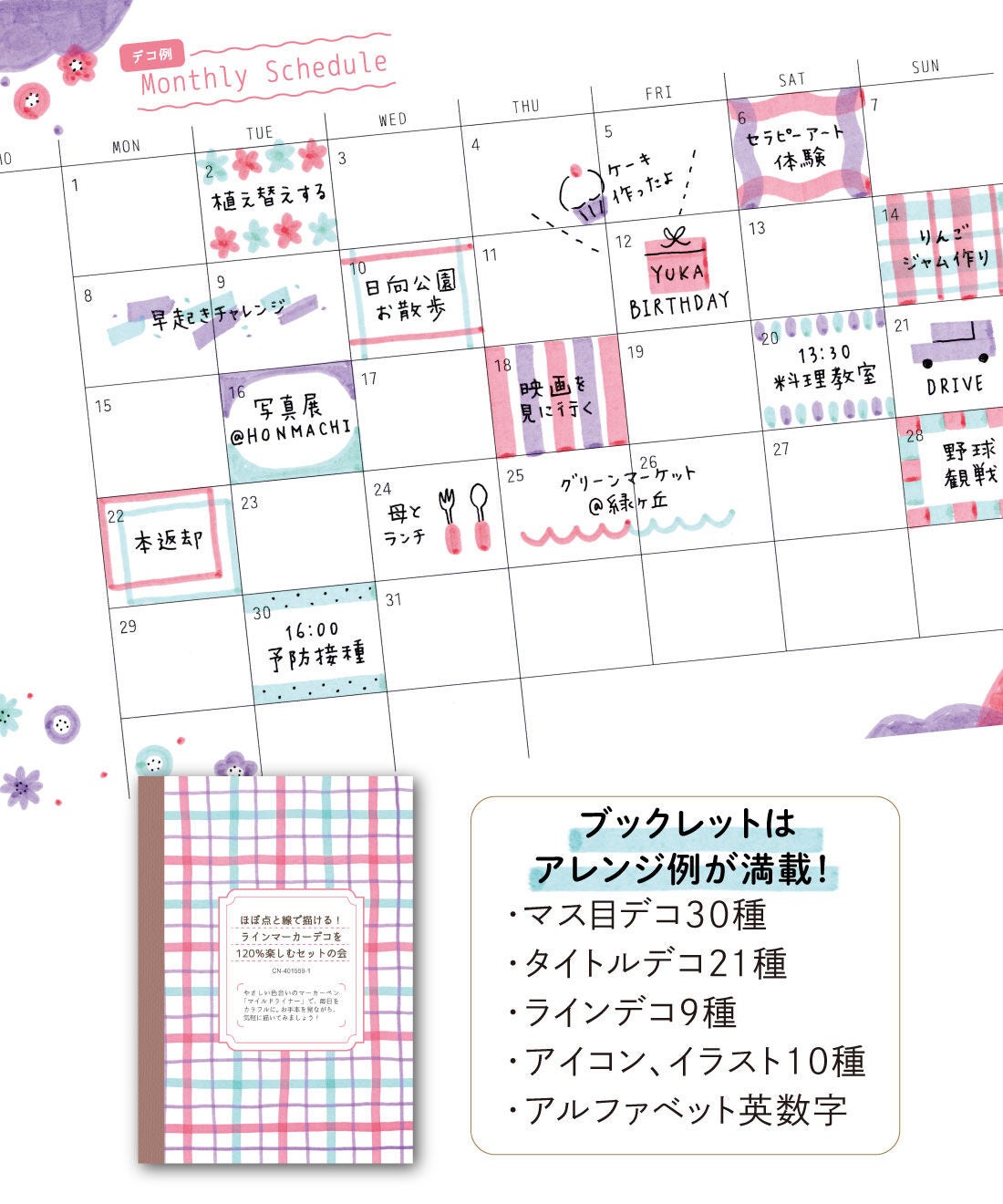 ブックレットにはアレンジ例が満載! マス目デコ30種、タイトルデコ21種など、毎月たっぷり楽しめます。