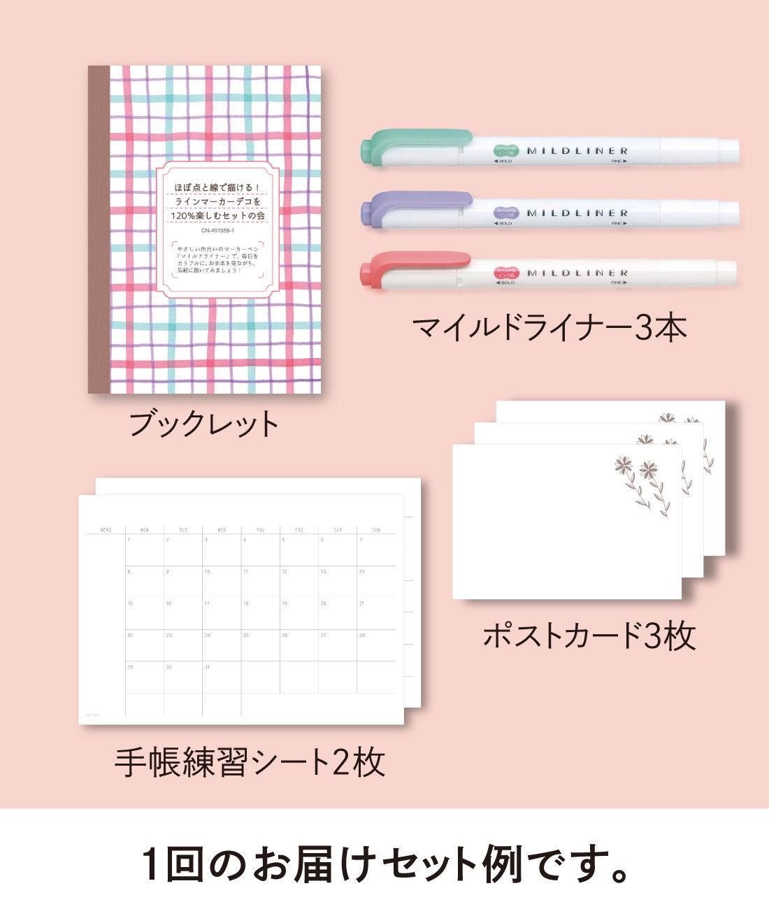 ブックレット、マイルドライナー3本、手帳練習シート2枚、ポストカード3枚が届きます。マンスリー手帳に描く予行演習ができるシートや、監修のOSONOさんの線画イラスト入りのデコって贈れるポストカードなど、充実の内容です。