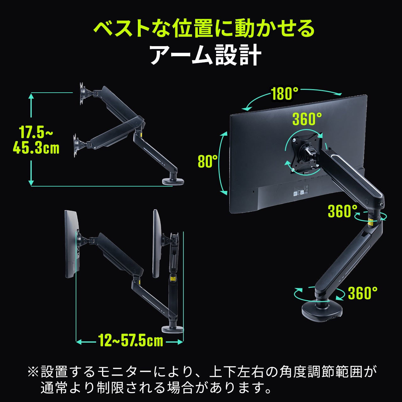 画面の向きを上下に80度、左右に180度調節が可能です。ディスプレイも360度回転させることができるので、ディスプレイを外すことなく縦向き、横向きの切替えができます。