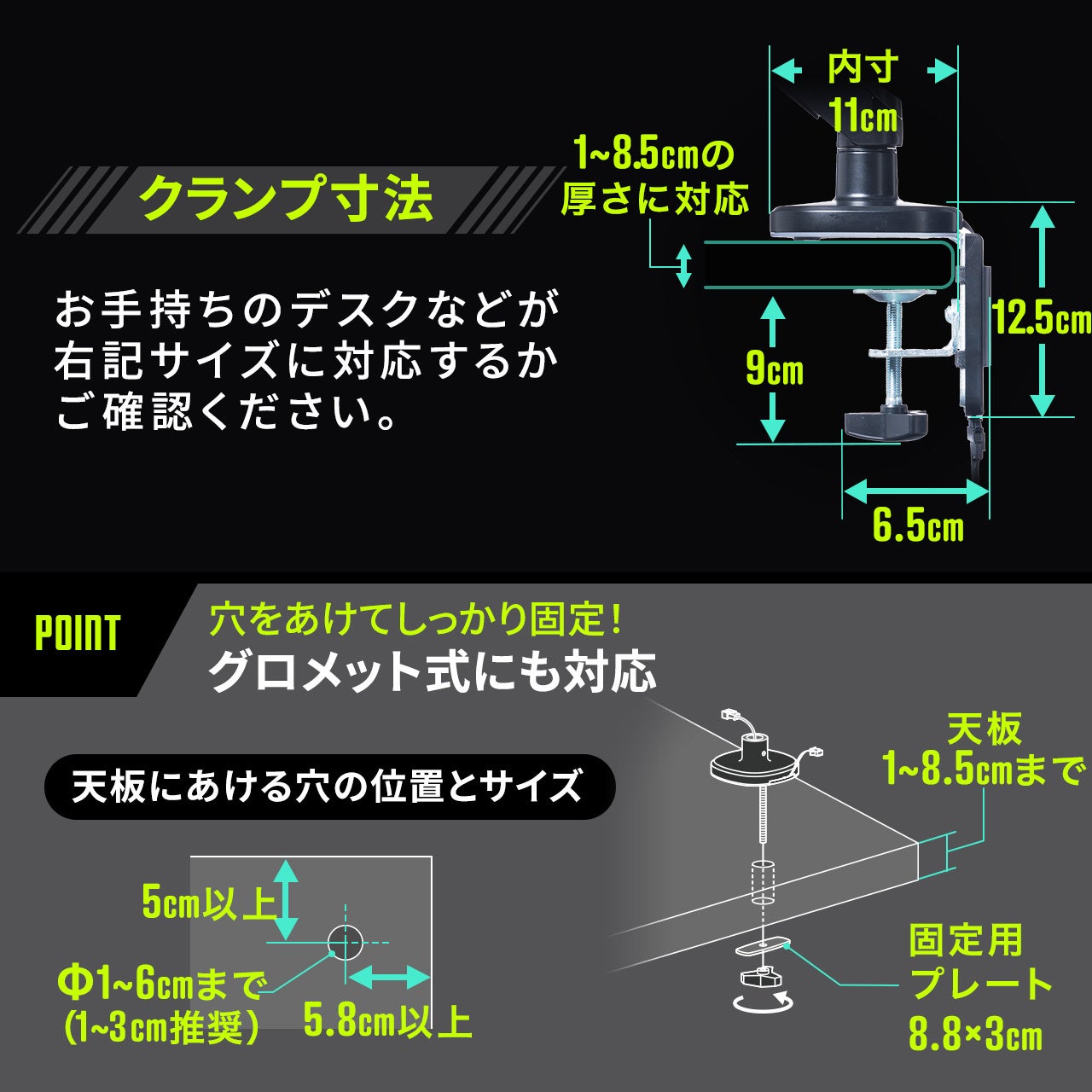穴をあけて設置するグロメット式にも対応しています。