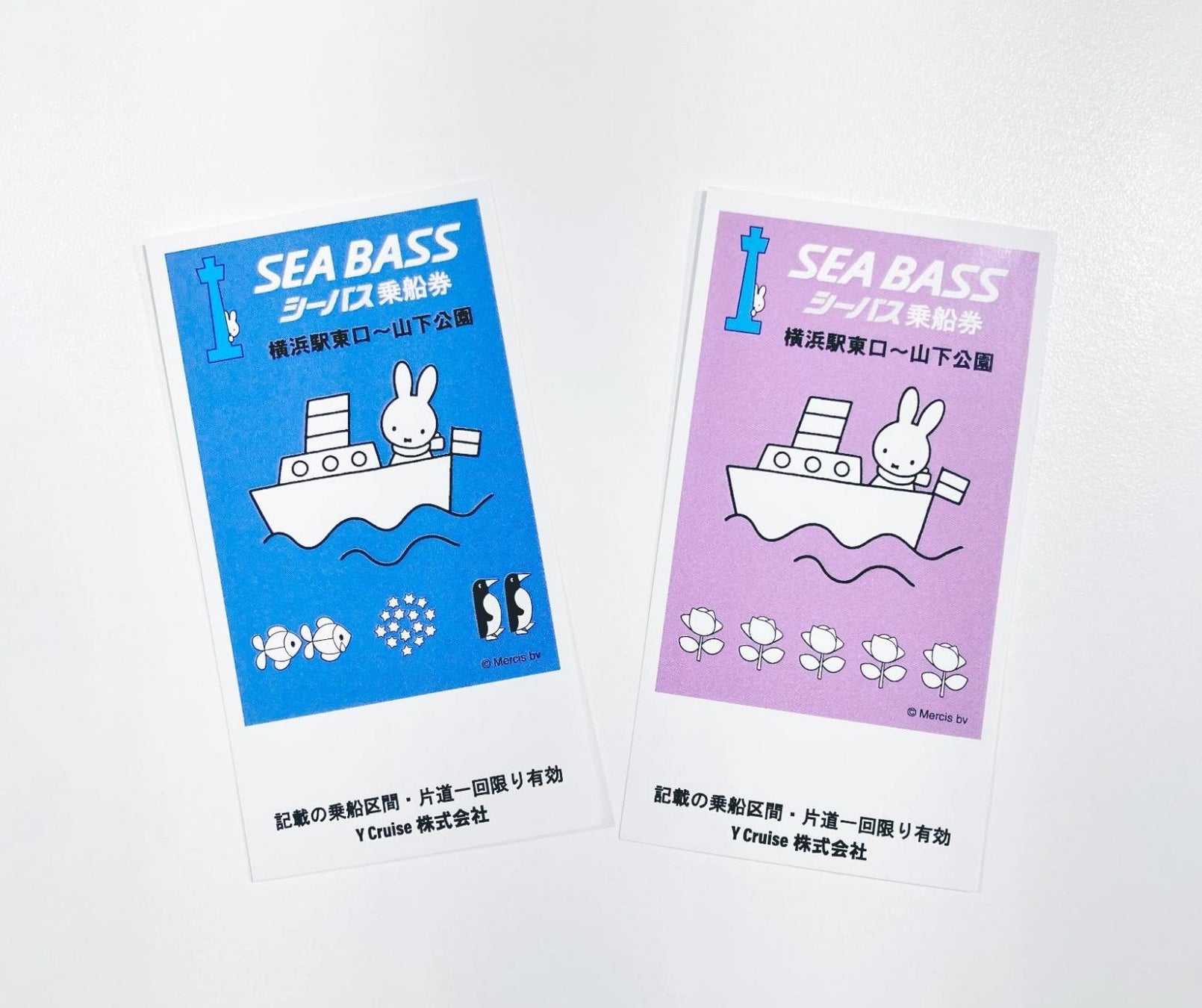 横浜駅東口(ベイクォーター内)乗り場と山下公園乗り場で、ポストカード付きのオリジナルデザインの乗船チケットを数量限定販売中です。東口では青、山下公園では紫のチケットをご用意しています。(特典のポストカードは横浜マリンタワーで配布するものと共通です)