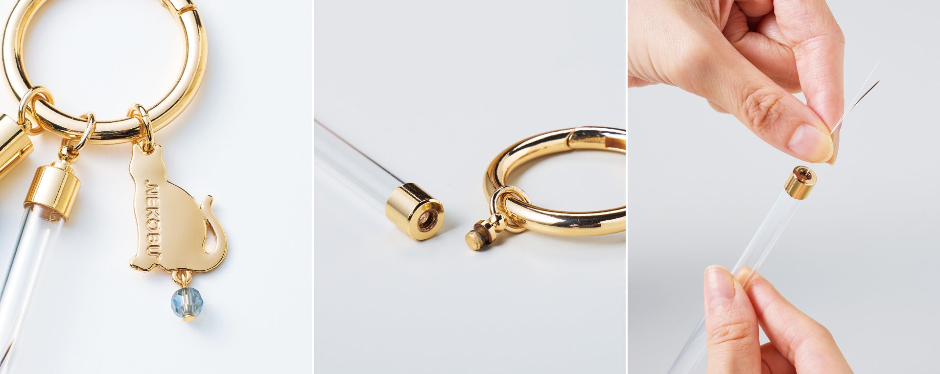 メタルチャームには猫部の刻印入りです。ケースは、ねじ式で開閉できます。開けて中にひげを入れます。猫のひげ以外にも、ビーズや他の動物のひげ、羽根などを入れても◎。自由にアレンジを楽しめます。