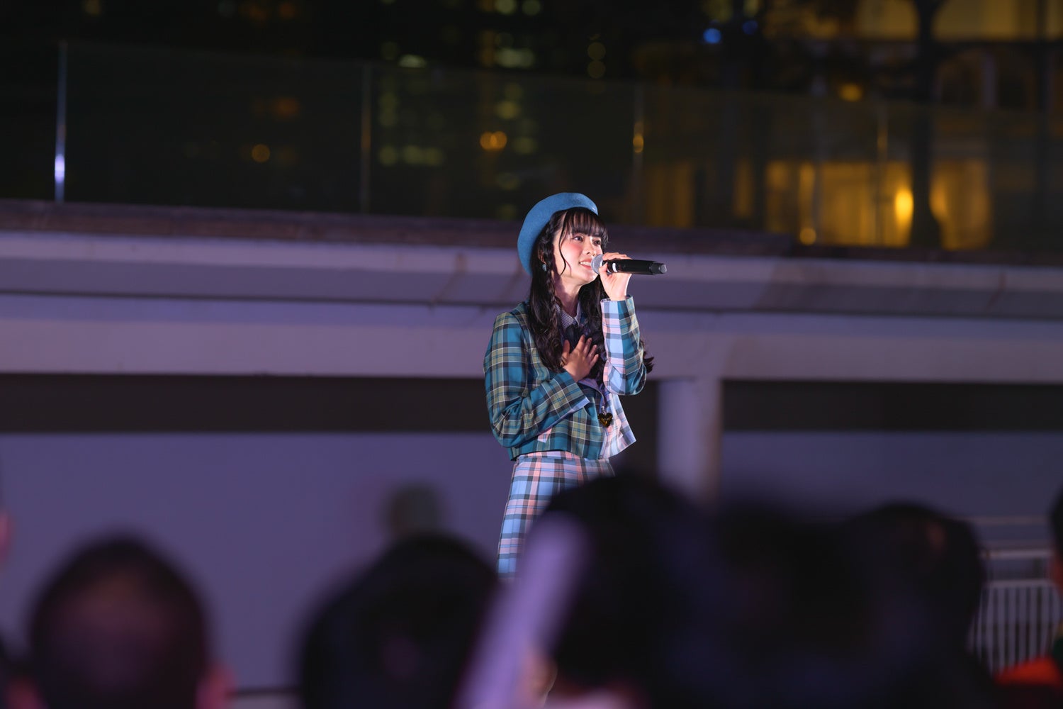 しっとりとサビを歌うところから始まり、イントロからどんどん盛り上がっていく楽曲。特にサビの開放感は素晴らしく、夜空に歌が広がっていく感じが、とても心地良かった。ファンも全力の50%、もしかしたらそれよりも抑えながらコールを送り、盛り上げる。そして曲の最後、ひとつの聴きどころとして〈まだ見ない、未来に行こう〉というセリフパートがあるのだが、ここは〈まだ見ない、〉だけ歌い、〈未来に行こう〉を観客に歌わせるというアレンジに。これにはファンも慌てて対応し、セリフを叫んでいた。