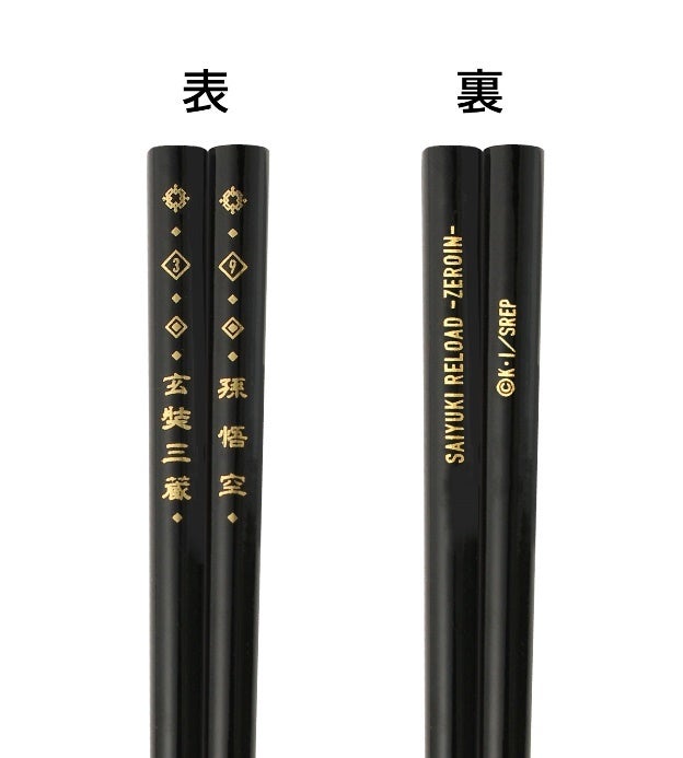 黒の箸に金プリントで玄奘三蔵と孫悟空、沙悟浄と猪八戒の名前やそれぞれを表す数字などを施しました。