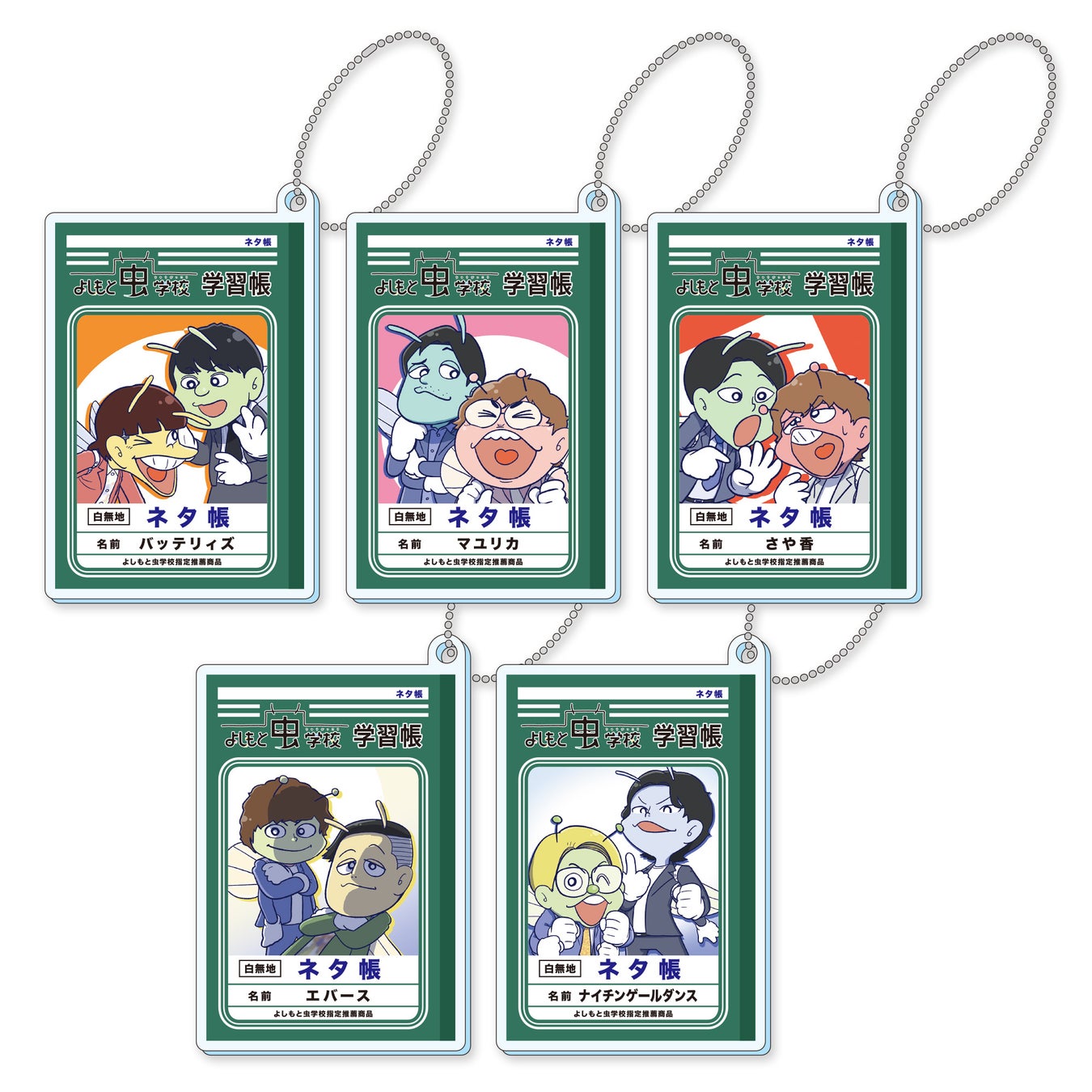 また、書籍第2弾を記念して新作グッズも発売が決定!バッテリィズ、マユリカ、さや香、エバース、ナイチンゲールダンスがアクリルキーホルダーになって登場します!