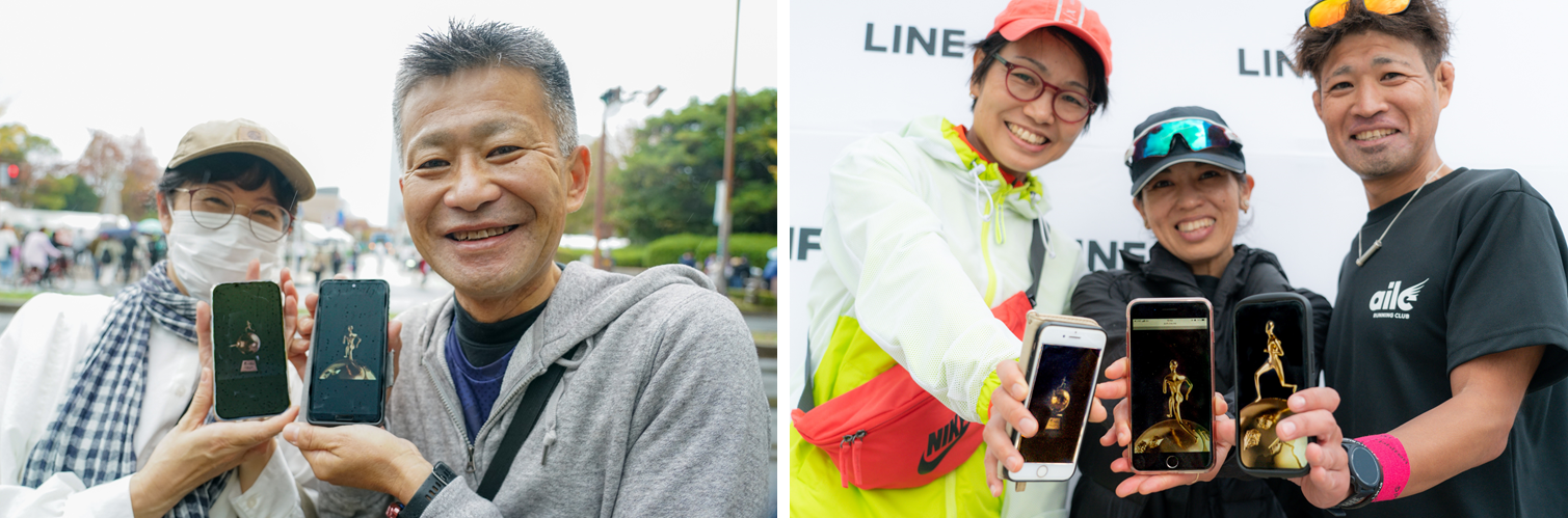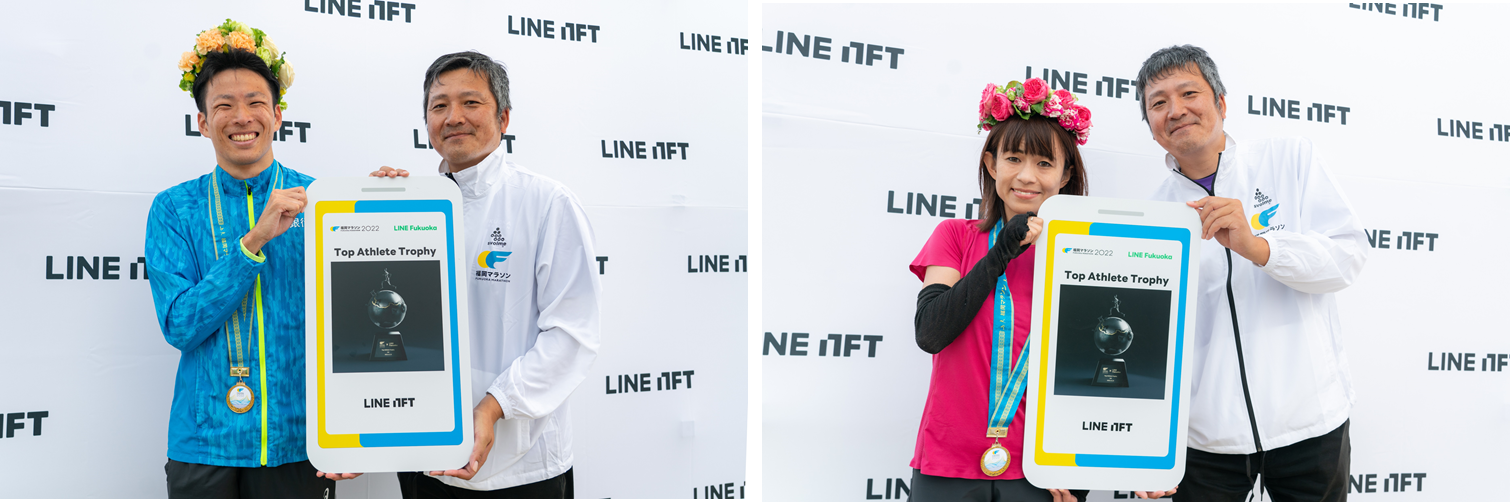 当日、男性部門・女性部門それぞれ8位以内に入賞したランナーには、バーチャルトロフィー(NFT)の授与が行われました。それぞれ1位で完走した受賞者は、受け取ったバーチャルトロフィー(NFT)について「カッコ良い!世界で一つのトロフィーを受け取れて嬉しい」、「メダルは持ち歩けないから、これだといつでも自慢できてすてき。応援してくれていた友達に一番に自慢したい」と喜びを語りました。