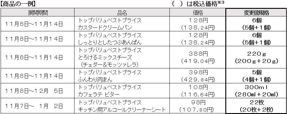 こうした中、イオンは、いつもご利用いただいているお客さまへの「ありがとう」の気持ちと、トップバリュ商品で家計を応援したいという思いから、数量・期間限定※2となりますが“いま欲しい”トップバリュ商品を増量します。