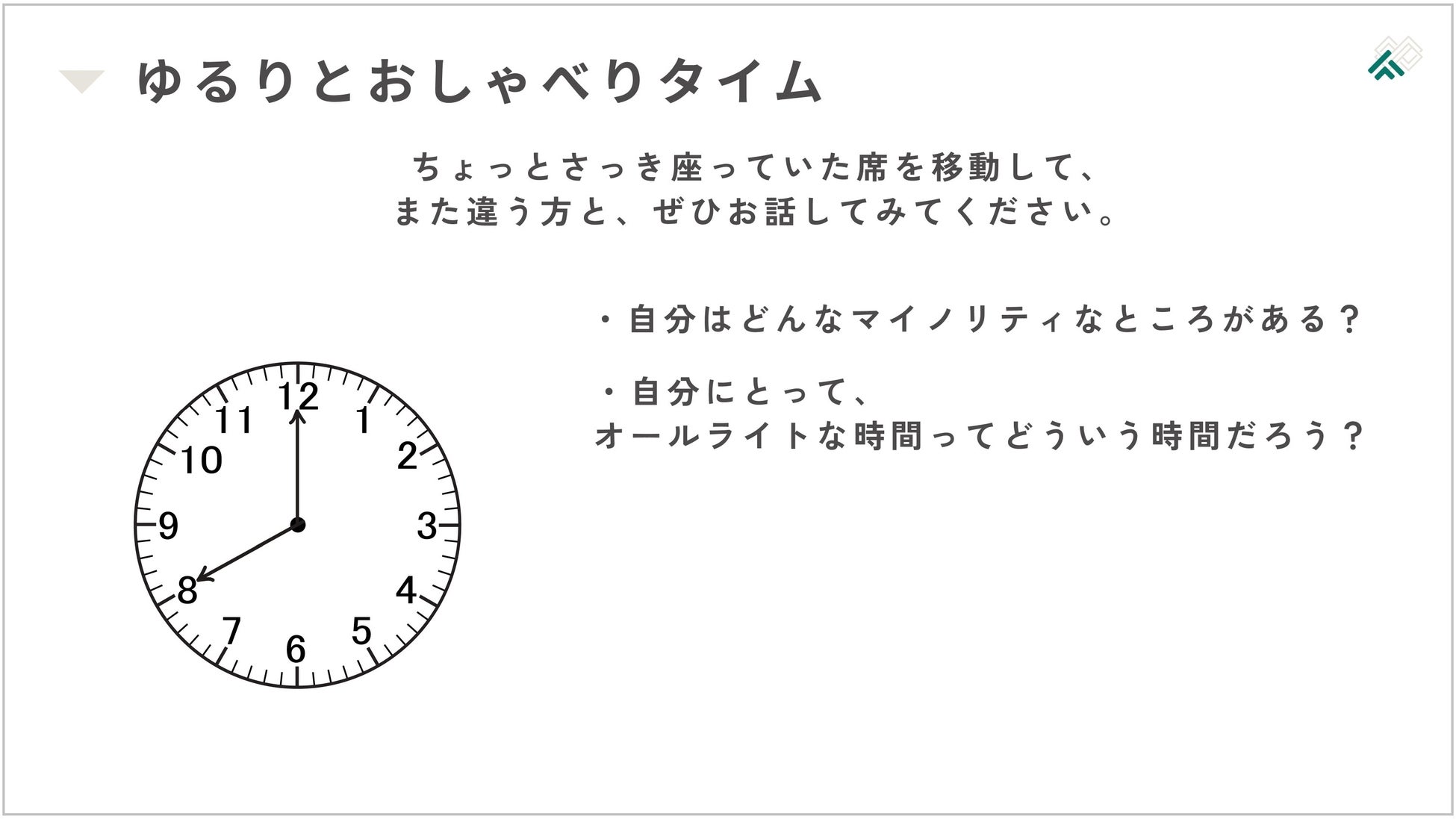 参加者同士がリラックスした雰囲気の中で、普段は話しにくいこと、聞きにくいことも安心して語り合える時間となりました。席移動することでまた新たな出会いに。多様な背景を持つ人々との交流を通じて、新たな気づきや発見が生まれました。