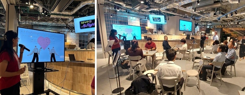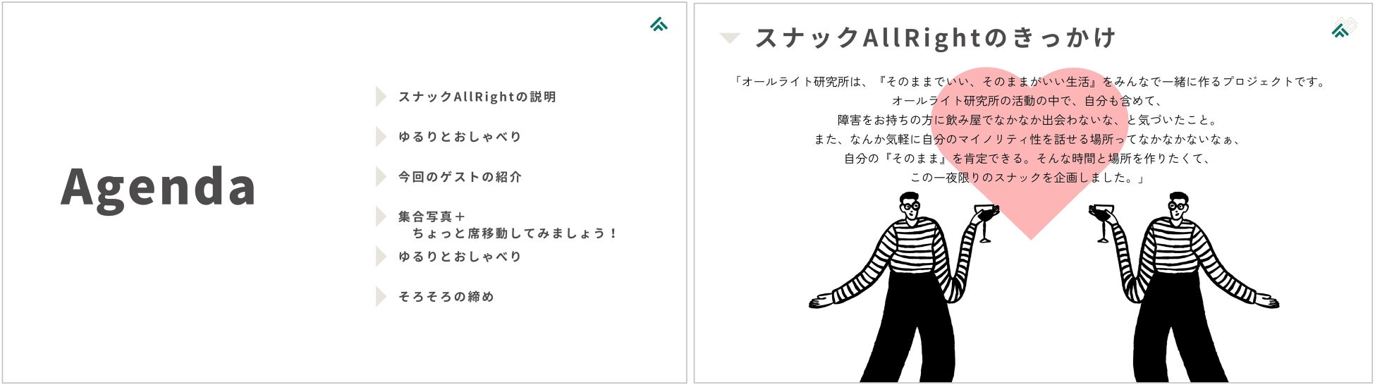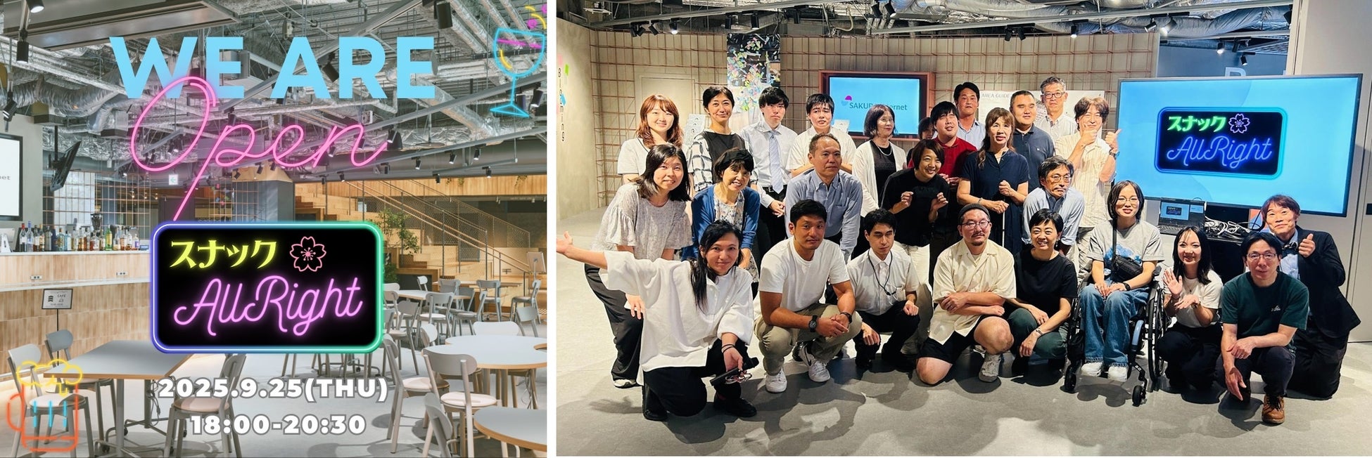 フェリシモが展開する、「オールライト研究所」は、「“そのままでいい”と出会える、一夜限りのスナック」をコンセプトに、『スナックAllright』を9月25日(木)にグラングリーン大阪(大阪市北区)にて、1日限定で初開催しました。本イベントは、株式会社毎日新聞社(本社:東京都千代田区、代表取締役社長:松木健)が設立した「ビジョン・コンソーシアム」とさくらインターネット「Blooming Camp」との共催により、「障がいがあっても無くても関係なくトークが楽しめるインクルーシブな場」を創出することを目的としました。当日は、会話のきっかけとしてお互いのことを少し知るための質問を募集し、普段ちょっと聞きにくいことも安心してお話できる場となりました。次回は12月5日(金)に同会場で開催予定です。